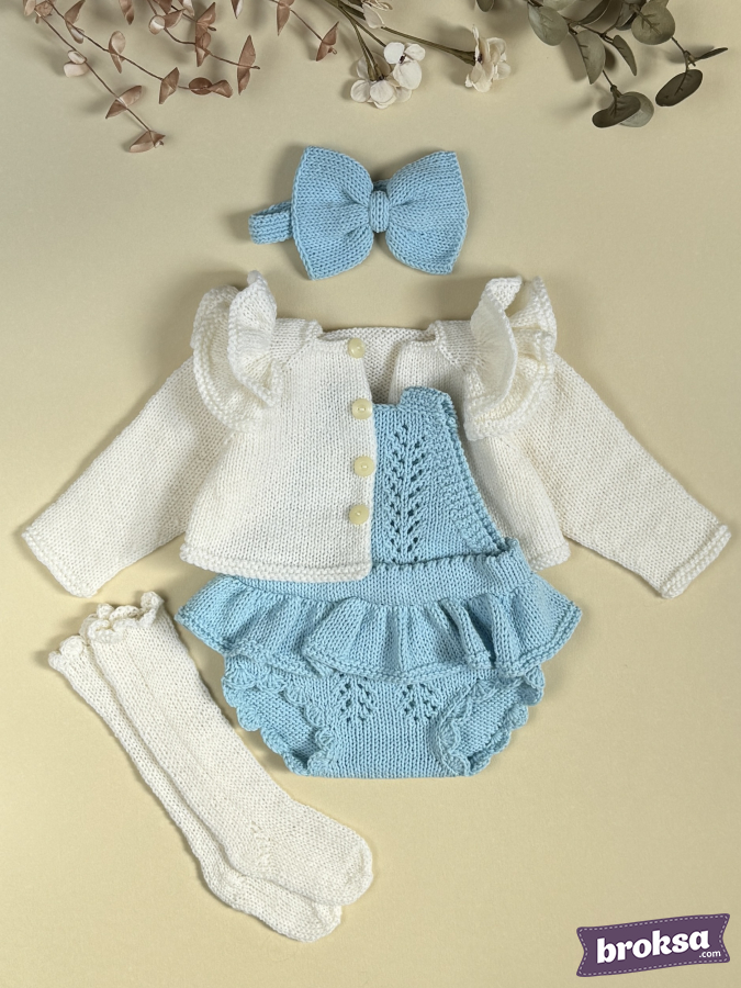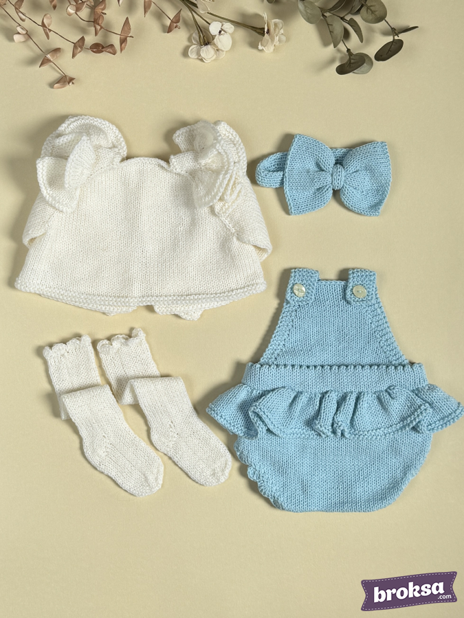A gentle sky-blue with milky knitted set for a reborn doll creates a clean, balanced look. A cardigan with shoulder ruffles and light buttons, an openwork romper with a ruffle, long socks, and a headband with a big bow. The fit is precise, and the attention to detail is felt in every line.