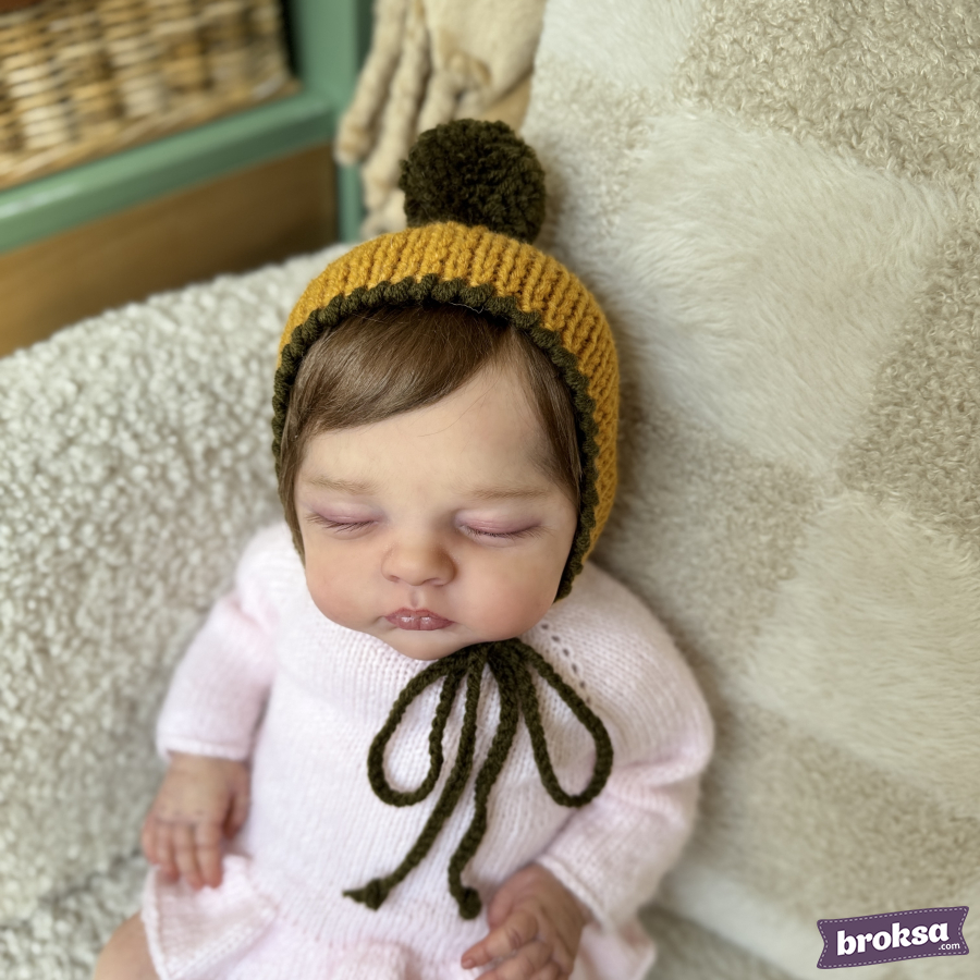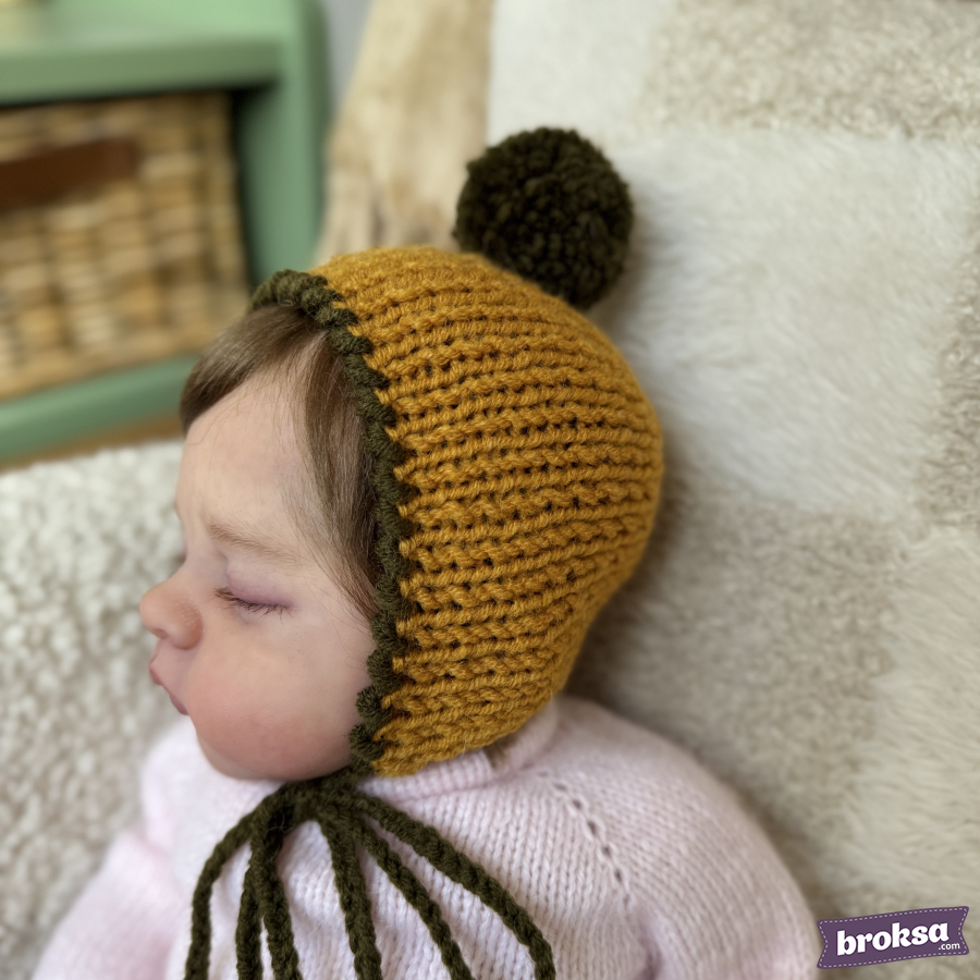 A warm knitted bonnet for a reborn doll in mustard color with an olive trim and a fluffy pompom. The knit is dense yet soft, pleasant to the touch. Ties gently secure the bonnet under the chin. Every detail is refined, so the accessory looks neat in a collection and in photos.