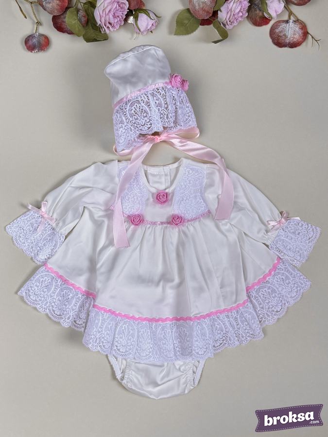 I present an exquisite artist-made set for a collectible reborn doll. The milky-white dress with a refined satin sheen softly flares toward the hem, accented with a wide lace flounce and a pink ribbon. The delicate lace yoke is adorned with three satin roses that add a touch of tenderness. Cuffs with lace ruffles, neat satin bows, and mother-of-pearl buttons on the back create a complete, truly collectible look. The bonnet with an airy lace brim and long satin ties elegantly frames the doll’s face, while the soft panties with gentle elastic ensure a tidy fit. The set looks impeccable on camera and in a display, ideal for those seeking exclusive sewn clothing for reborn dolls, artisan reborn outfits, and premium clothing for collectible reborn dolls with an emphasis on high craftsmanship and detail.