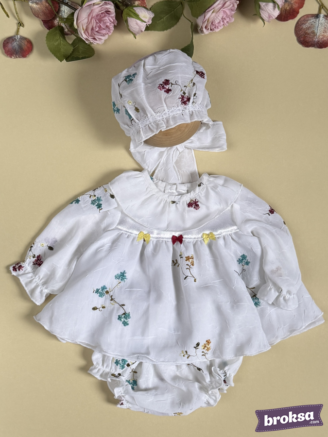 Set includes: long-sleeve dress, bonnet with ties, bloomer panties.