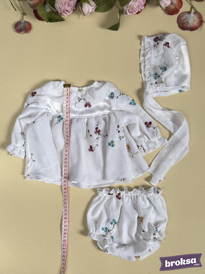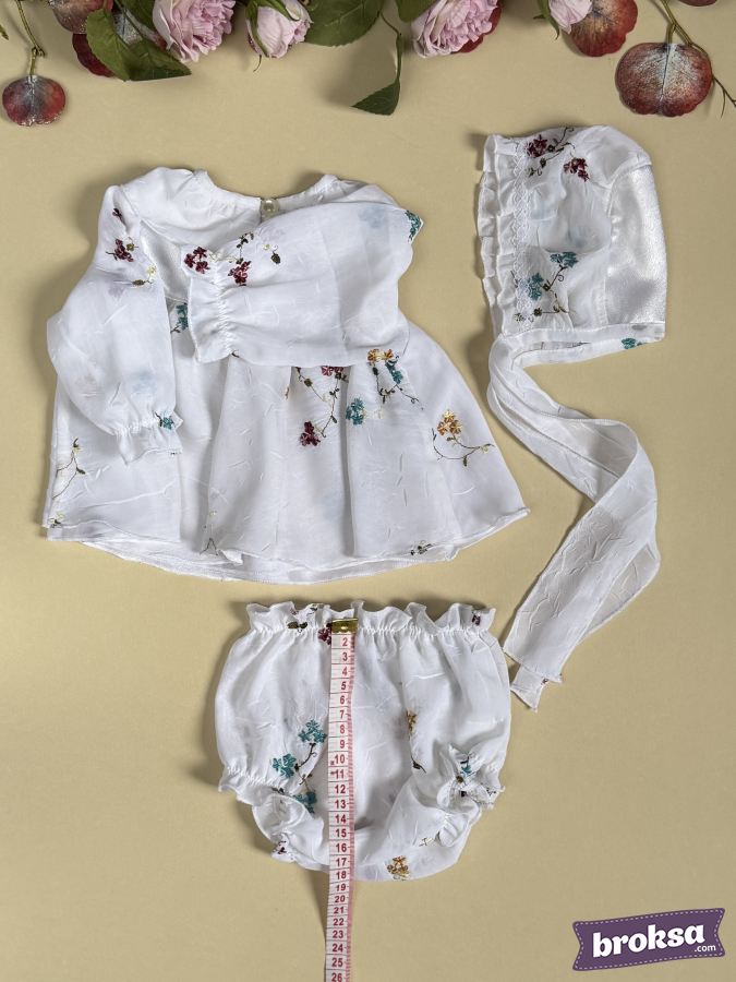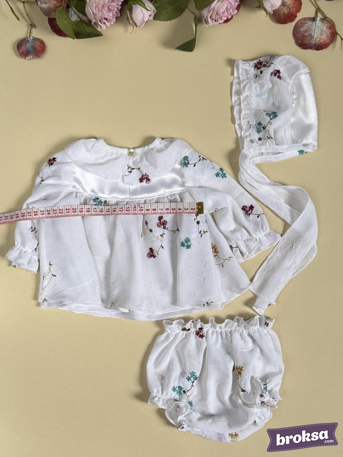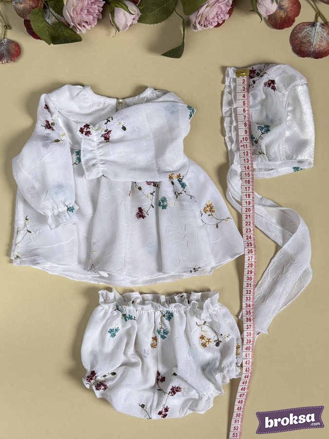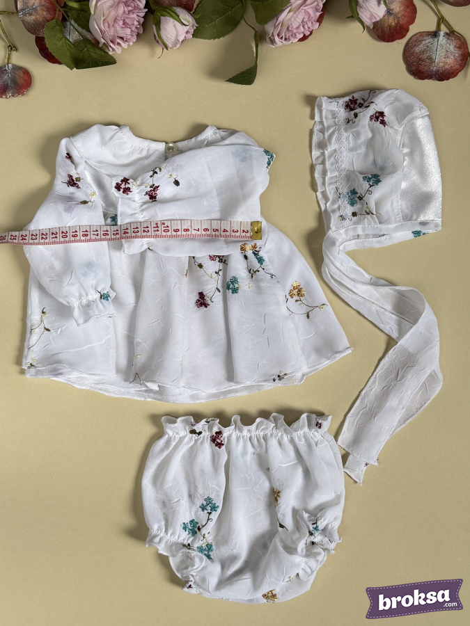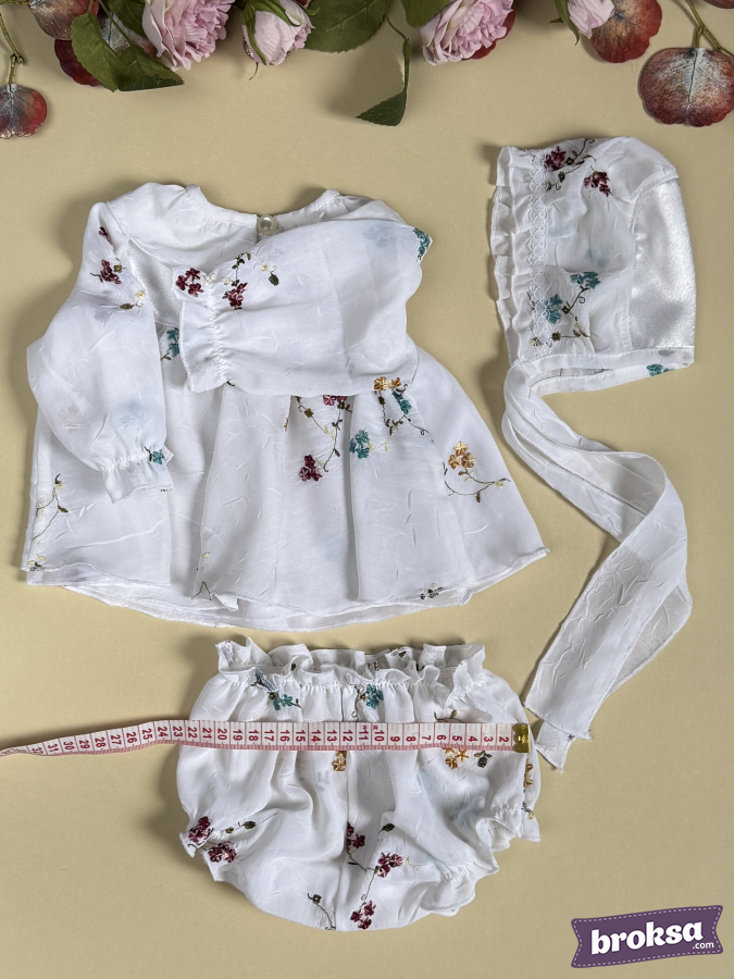 I offer my original, refined set for a collectible reborn doll — a white ensemble with a delicate floral pattern in shades of burgundy, turquoise, and mustard. A lightweight dress with a softly flared silhouette and a satin yoke is adorned with tiny bows; gathered sleeves emphasize the doll’s delicate proportions, and soft elastics ensure a flawless fit. A bonnet with lace trim and long ties completes the look, while airy bloomer panties sit neatly and hold their shape. This is an exclusive sewn clothing set for reborn dolls with an emphasis on premium materials and high craftsmanship, created for photos, display cabinets, and to complete your reborns’ look.