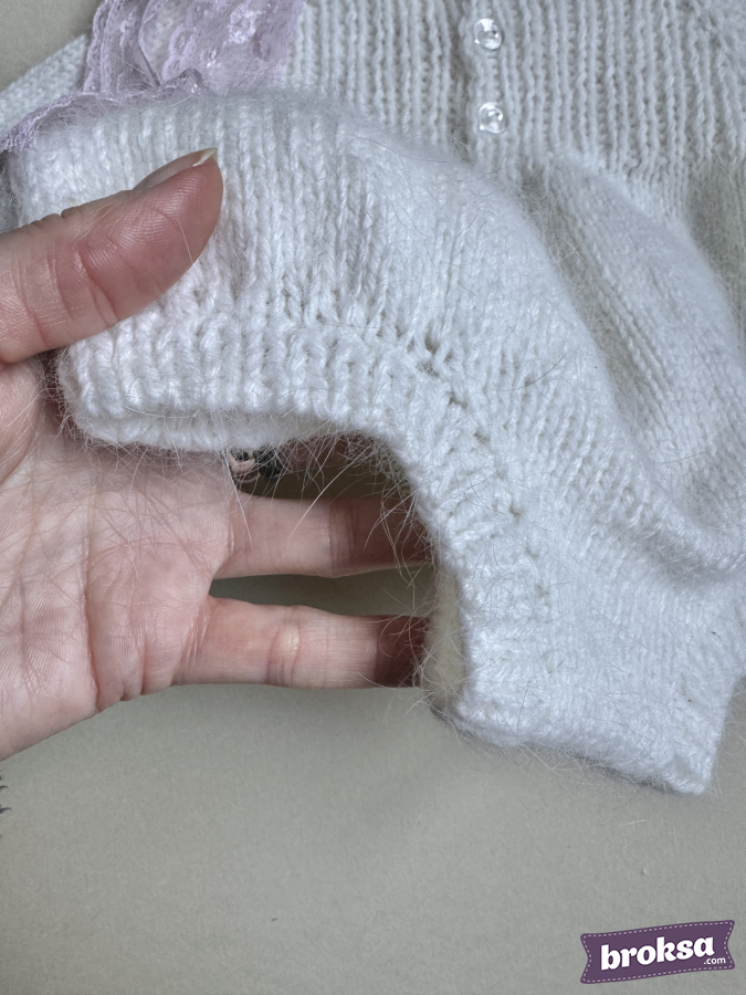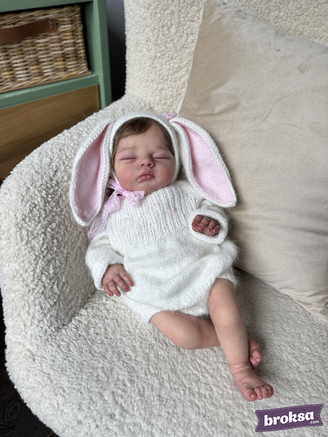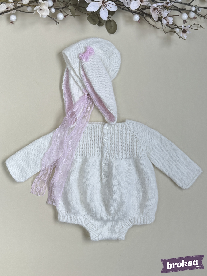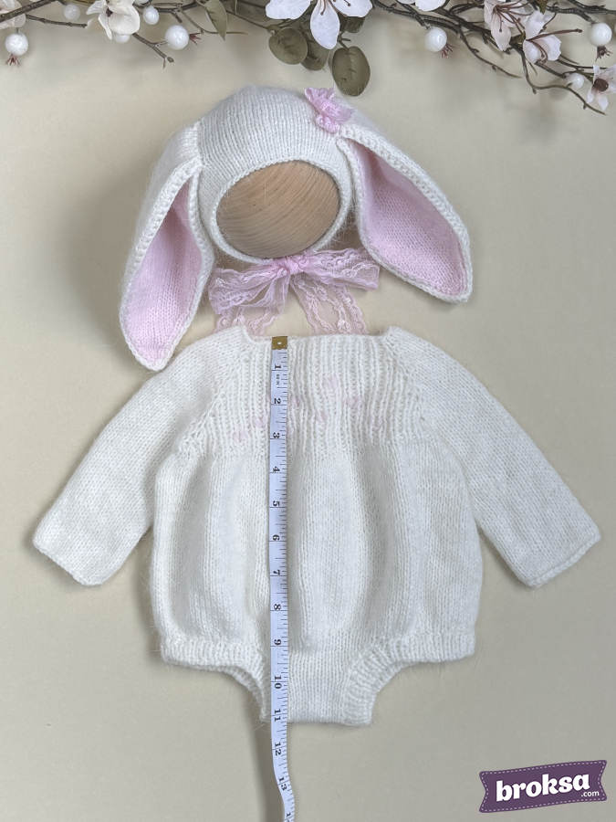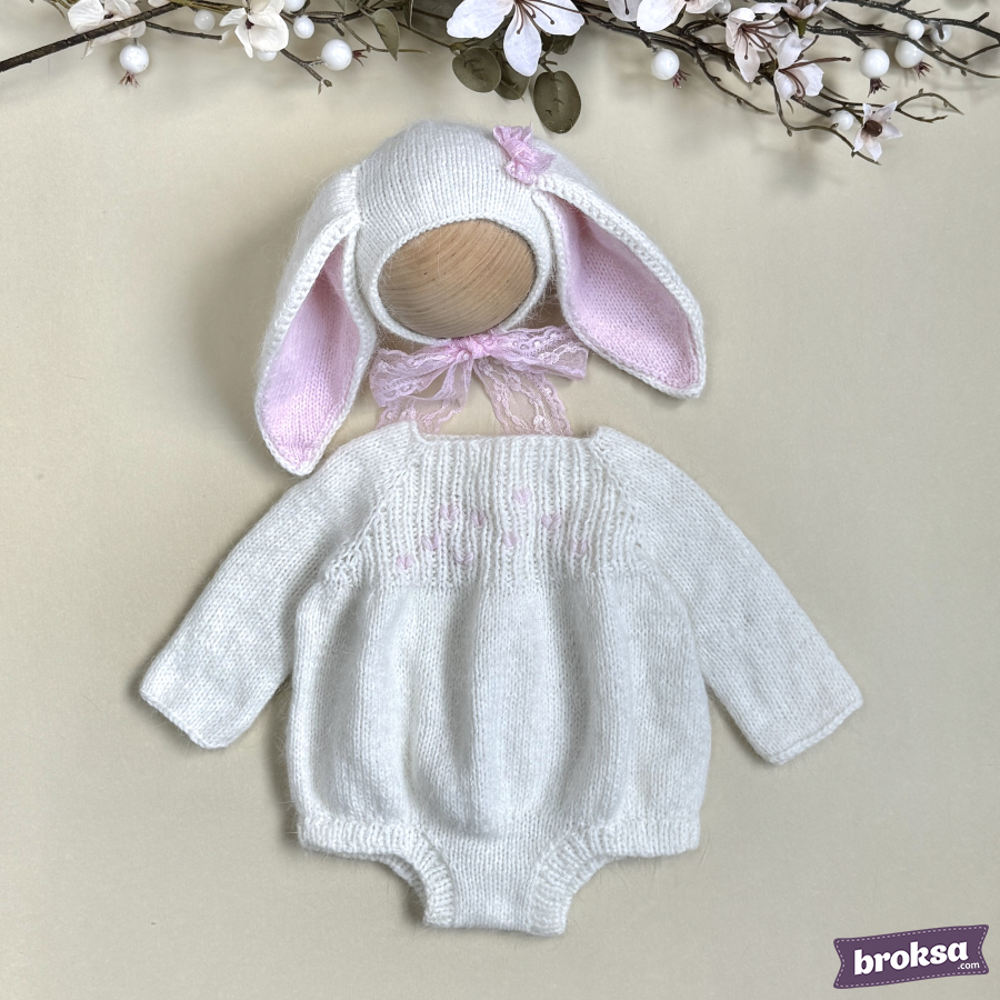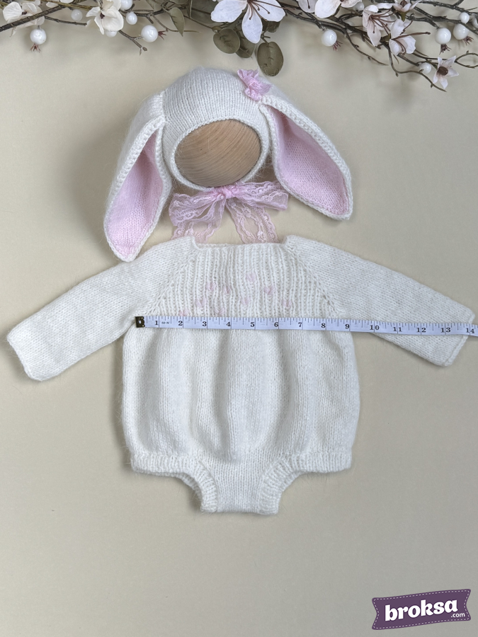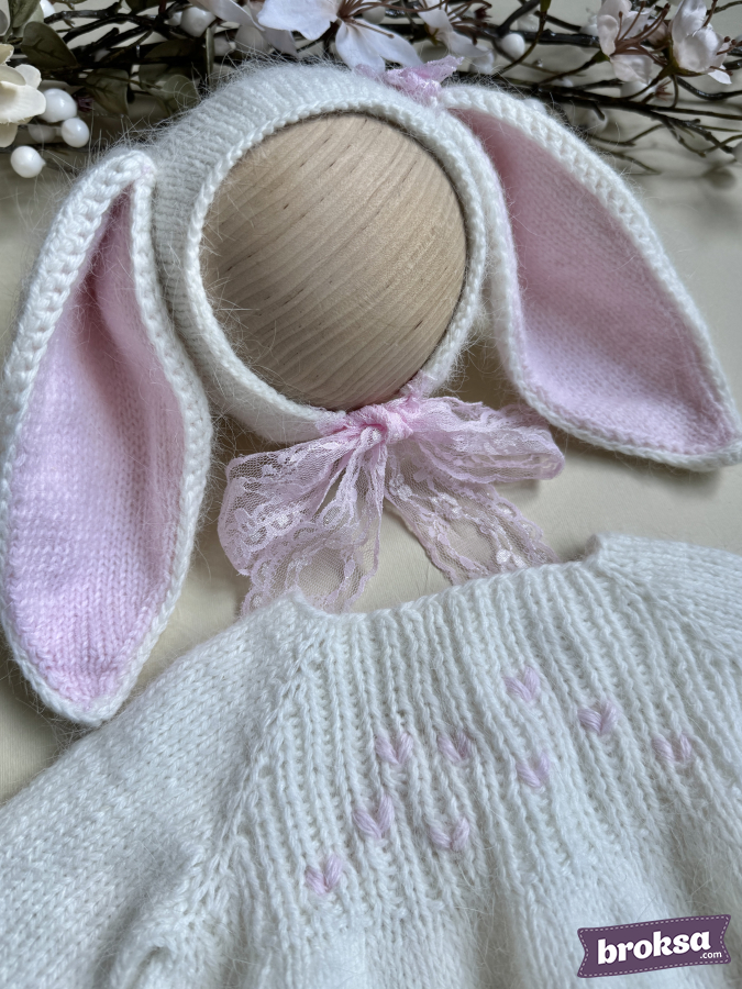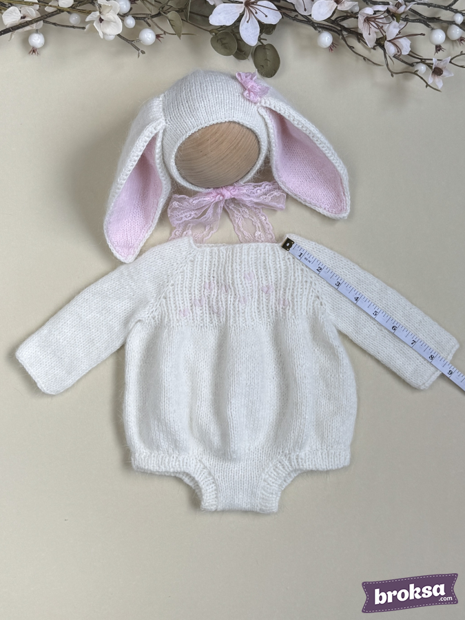 I offer a delicate knitted set for a collectible reborn doll. The creamy white long-sleeve bodysuit has a soft, slightly fluffy texture and delicate pink hearts on the yoke. The bonnet features long ears with pink inner parts and a lace tie. The fit is perfect, and every detail shows care for the doll's look.