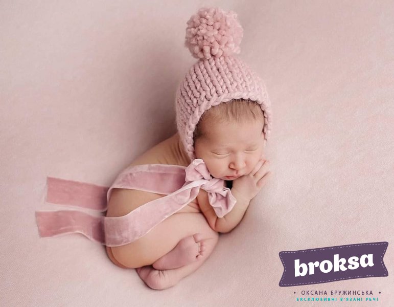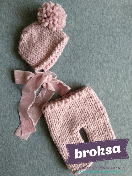 The pink set of pants and hat is knitted using hypoallergenic acrylic yarn. This bonnet is decorated with pom pom and lovely velvet ribbons. The set is ideally suited for both boys and girls. The size fits for kids of age up to two weeks.