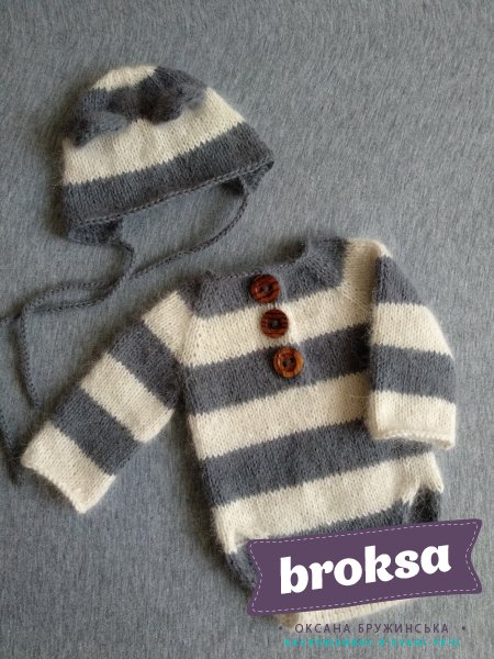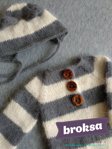 This adorable set of bodysuit and hat with ears is knitted from Italian angora yarn and decorated by wooden buttons. The set is ideally suited for both boys and girls. The size fits for kids of age up to two weeks.