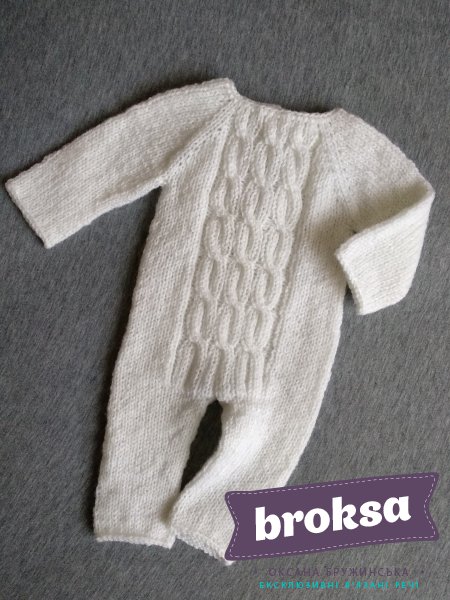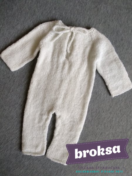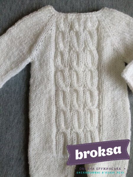 This sleepsuit is knitted using soft hypoallergenic yarn. Front side has an interesting braid pattern. The back is decorated with tied up laces. It suits for both boys and girls. The size of the suit fits for infants up to two weeks.