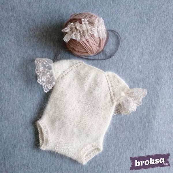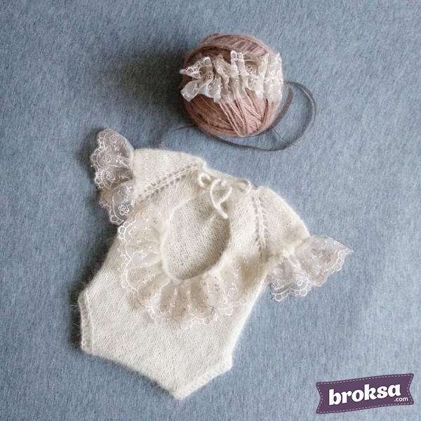 This fluffy bodysuit is tied with Italian Angora yarn. The back of the bodysuit has a cutout in the form of a drop decorated with lace. The sleeves are decorated with the same lace. The bandage is included in the set. The kit is perfect for girls under two weeks of age.