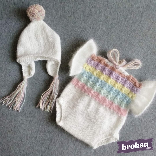 Fluffy suit is knitted with a mink yarn. The front of the body has openwork rainbow strips. The hat is decorated with pompom and tassels in the tone of the bodysuit. The kit is perfect for babies up to 50 cm.