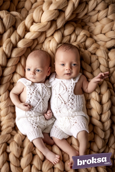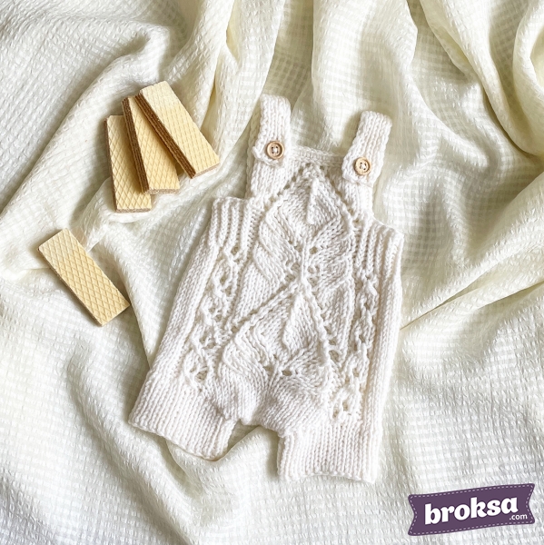 This gentle romper, crafted from soft merino wool, is specially designed for your baby's first photoshoots. An elegant, hand-knitted Japanese-style pattern adorns the front, adding a unique touch. The yarn is completely non-itchy, and the convenient button closures ensure comfort during the session.