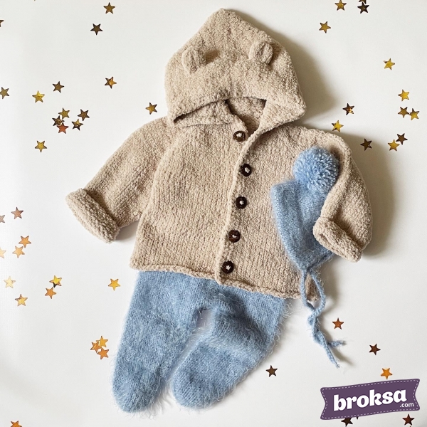 Soft suit with cute ears on the hood. The hat is decorated with a pompom. Trousers with a drawstring, which allows you to adjust the width of the belt. Plush yarn, can be used for baby photo shoots. Choose the desired size and color.