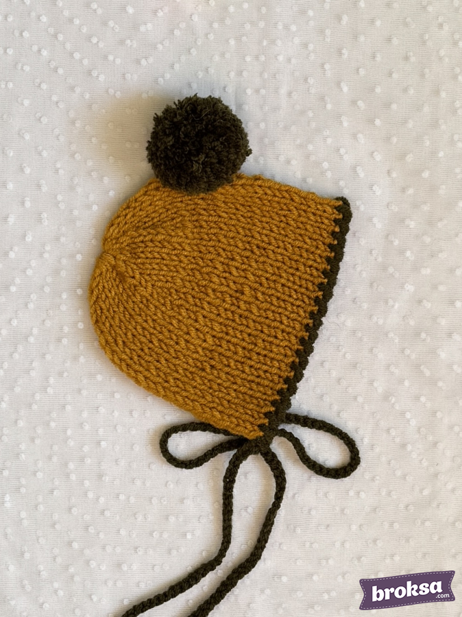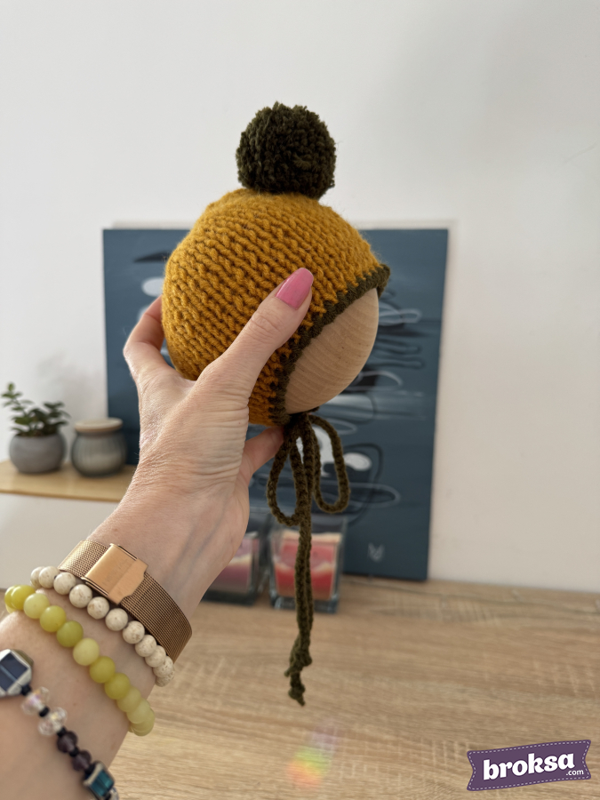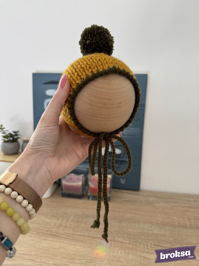 A warm knitted bonnet for a reborn doll in mustard color with an olive trim and a fluffy pompom. The knit is dense yet soft, pleasant to the touch. Ties gently secure the bonnet under the chin. Every detail is refined, so the accessory looks neat in a collection and in photos.