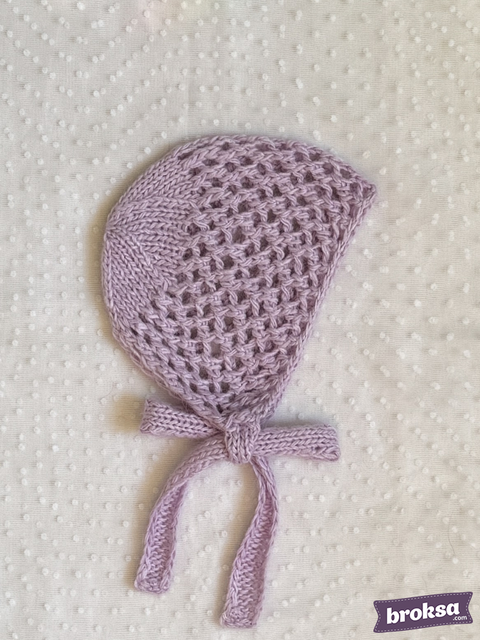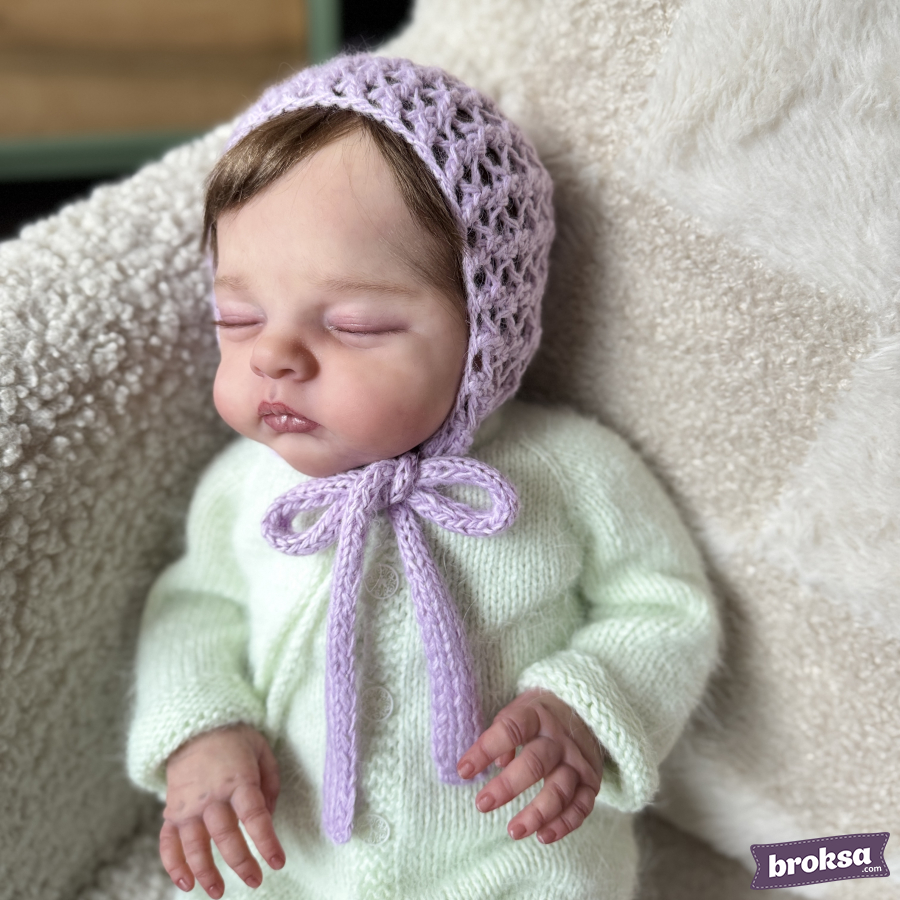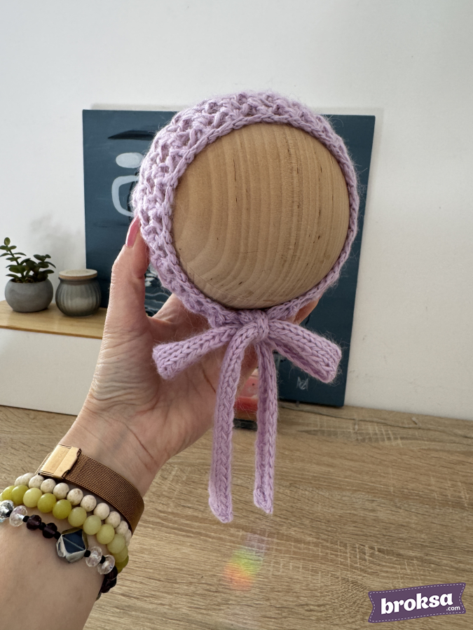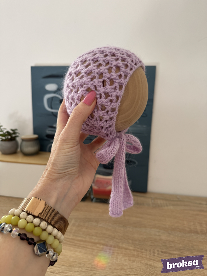I offer a lavender knitted bonnet for reborn dolls. The lace mesh gently wraps the head, and the wide ties form a cute bow. The yarn is soft to the touch. A refined accent for photos and your collection.