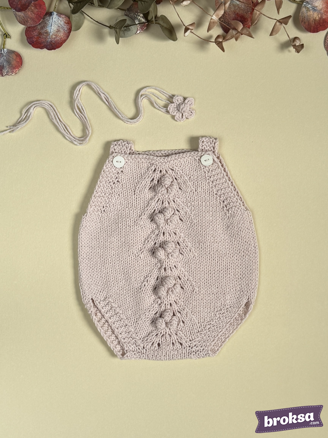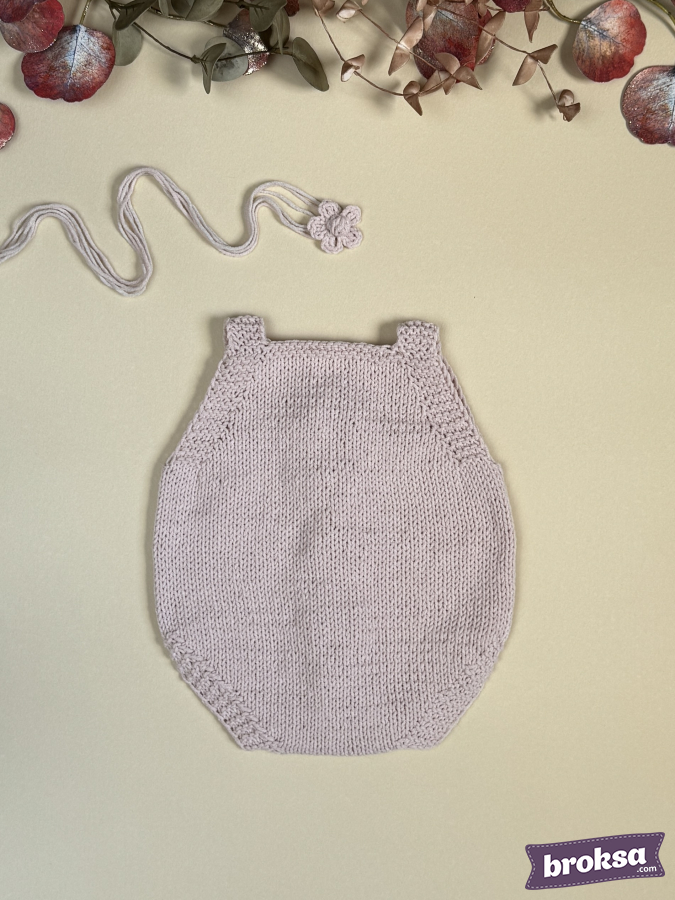 I offer a delicate knitted bodysuit for a reborn doll in a powder-lavender shade. The soft texture lies smoothly and provides an ideal fit. At the front, a panel of dimensional bobbles and lacy accents; shoulder straps with buttons. Attention to detail is evident in the neat edges and the symmetry of the pattern. The set includes a matching flower headband.