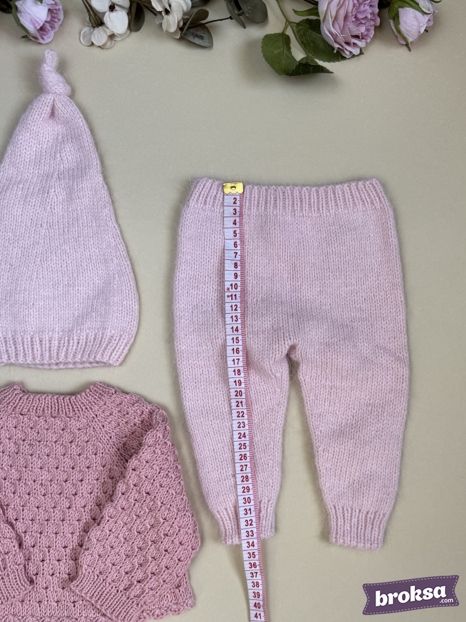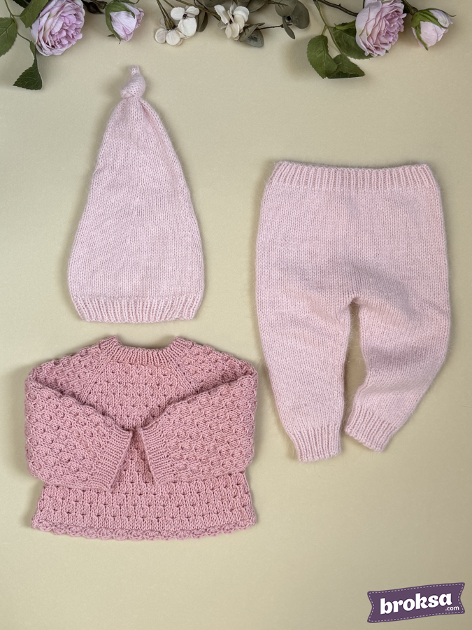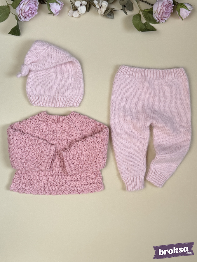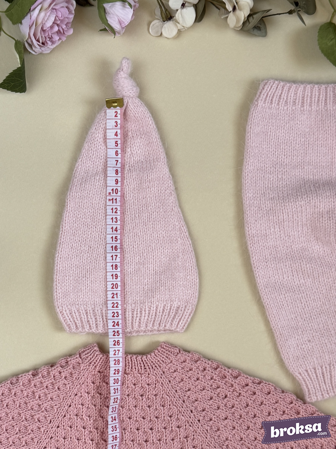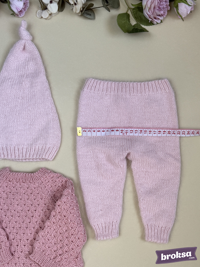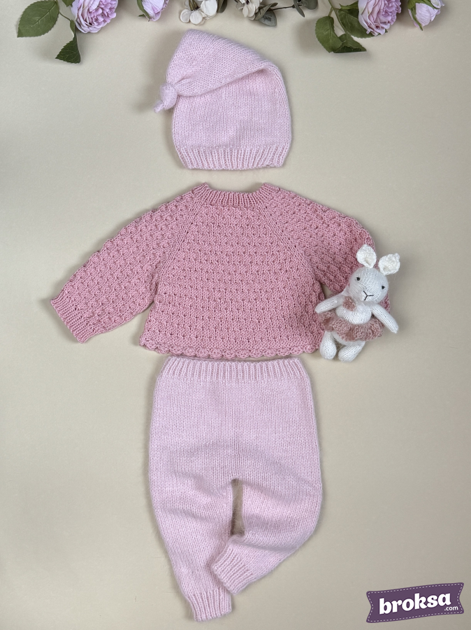 I offer a soft pink knitted set for a reborn doll. A sweater with a voluminous textured pattern, plain pants, and an elongated cap with a knot create a harmonious look. The soft, fluffy yarn is pleasant to the touch, and the elastic cuffs ensure a perfect fit. Neat edges and the symmetry of the pattern highlight attention to small details that collectors appreciate.
