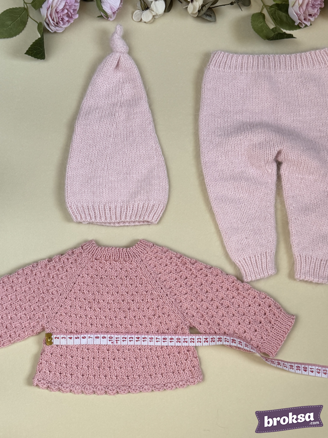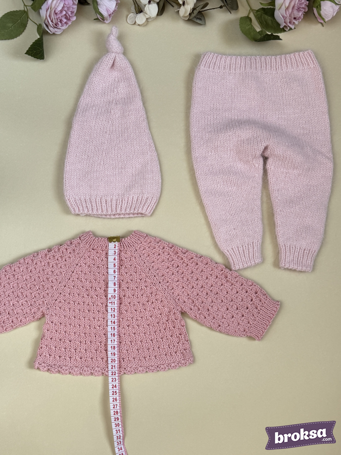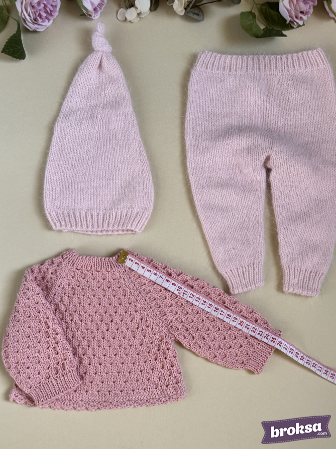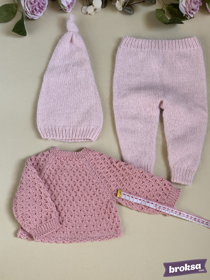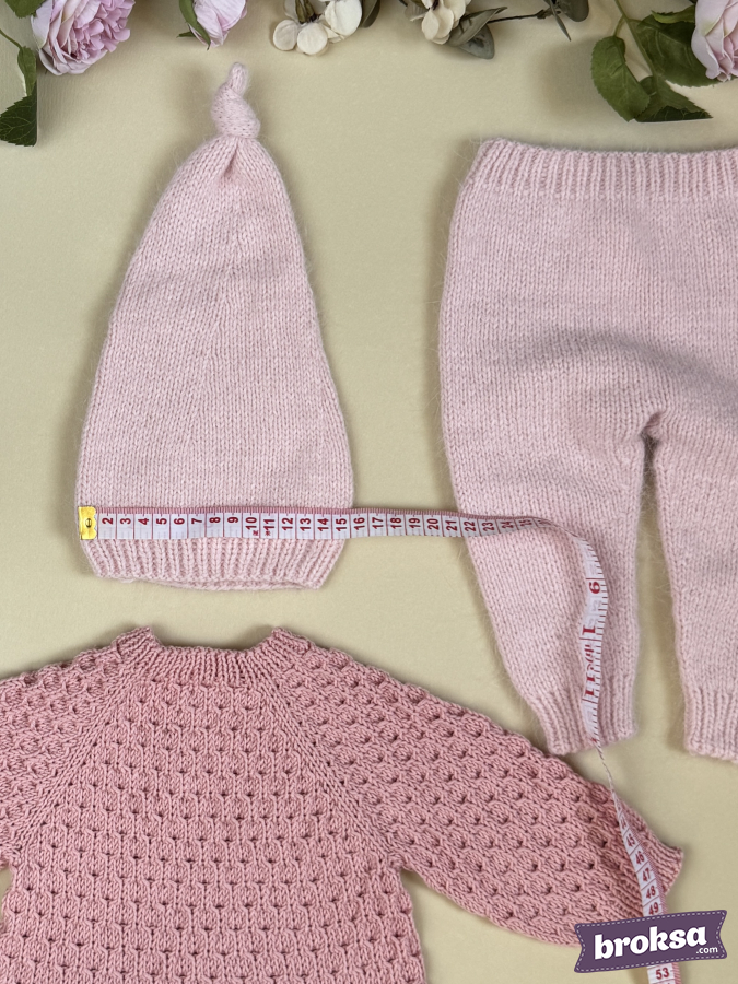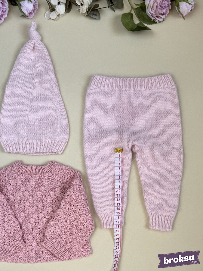 I offer a soft pink knitted set for a reborn doll. A sweater with a voluminous textured pattern, plain pants, and an elongated cap with a knot create a harmonious look. The soft, fluffy yarn is pleasant to the touch, and the elastic cuffs ensure a perfect fit. Neat edges and the symmetry of the pattern highlight attention to small details that collectors appreciate.