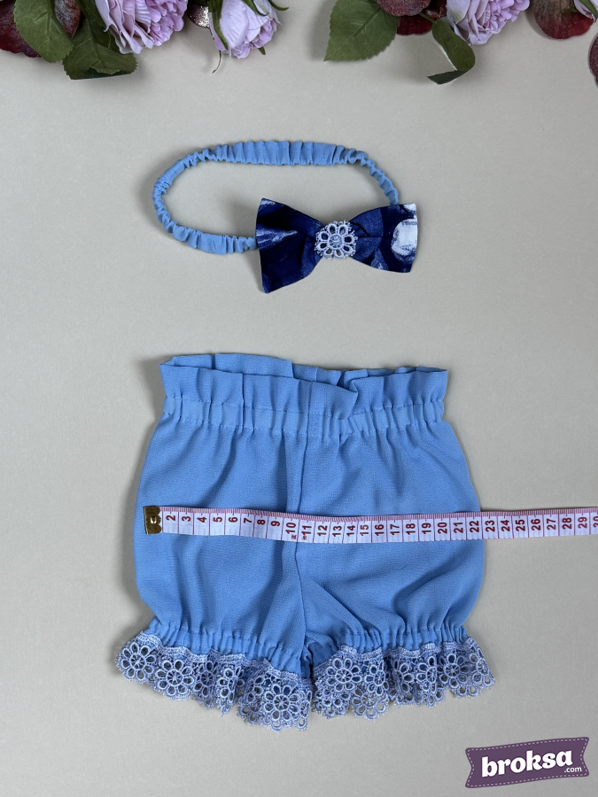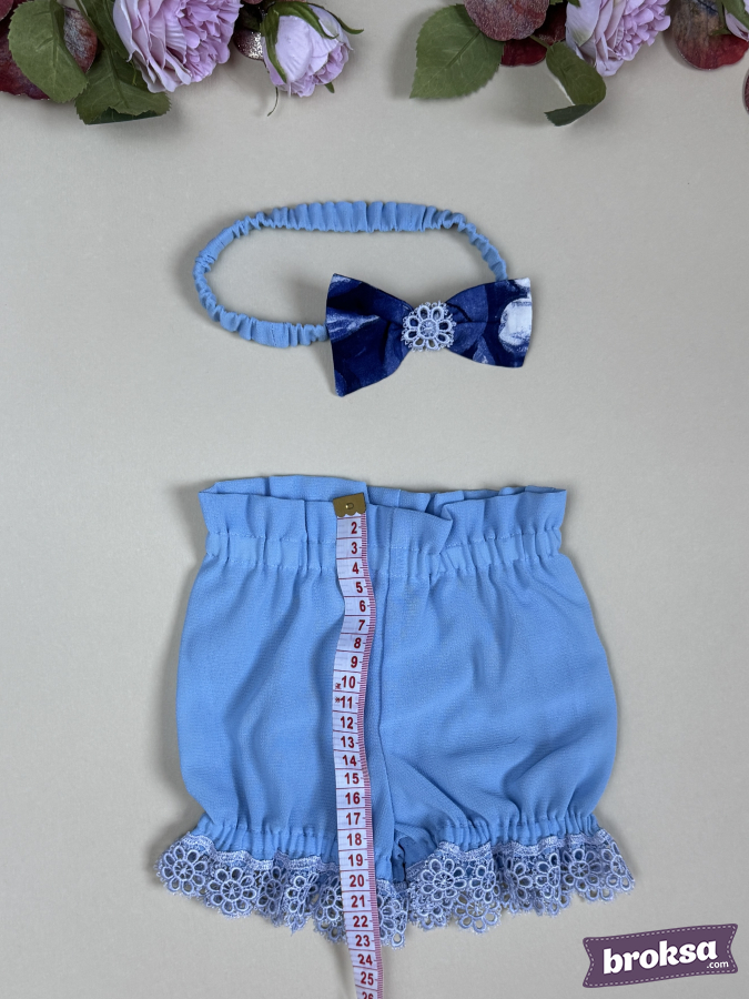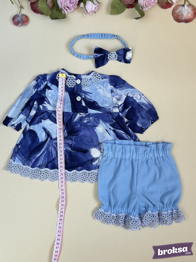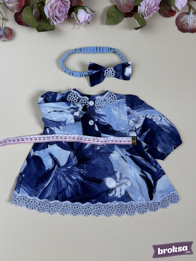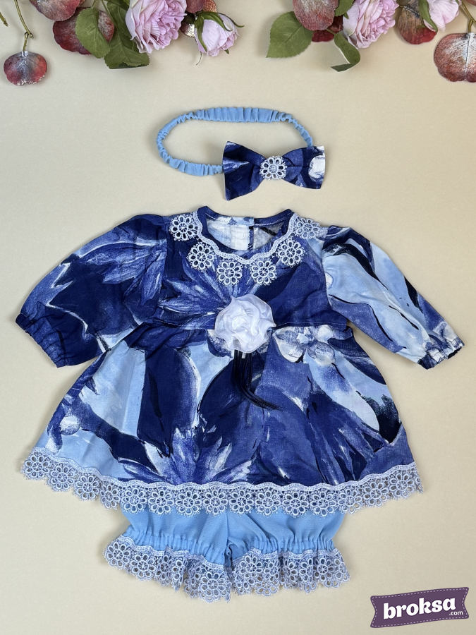 I offer a refined designer set for collectible reborn dolls. A dress with a watercolor print in deep indigo and sky-blue hues looks impeccable and elegant. The hem and neckline are trimmed with flower-shaped lace, and the waist is accented with a delicate dimensional flower. Long sleeves with soft gathering, neat buttons on the back. The fit is engineered to the millimeter: the silhouette sits smoothly, highlights the proportions, and holds its shape while posing. Solid-color knit bloomer shorts with an elastic waistband and lace ruffles complement the dress, and an elastic headband with a matching bow completes the look. This is an exclusive sewn garment for reborn dolls that showcases high craftsmanship, quality materials, and attention to every detail.