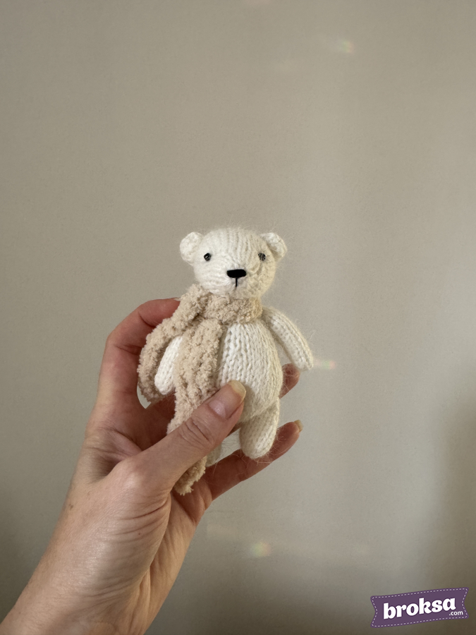 Presenting a mini teddy bear in a creamy tone with a fluffy beige scarf. This is a knitted toy for photoshoots that looks harmonious next to a baby and a reborn doll. Neat fine knit, soft texture, springy body. The perfect height for the frame.