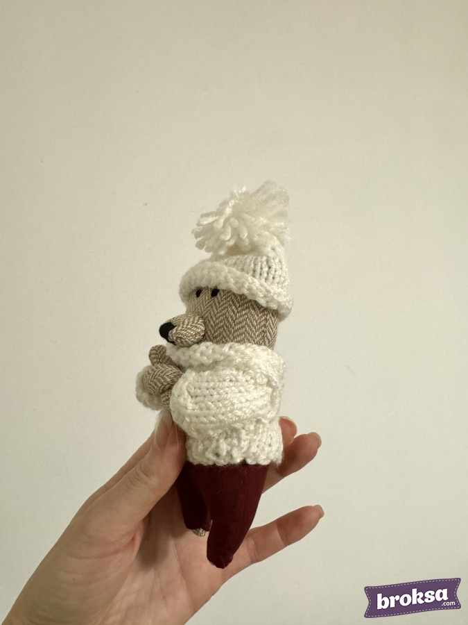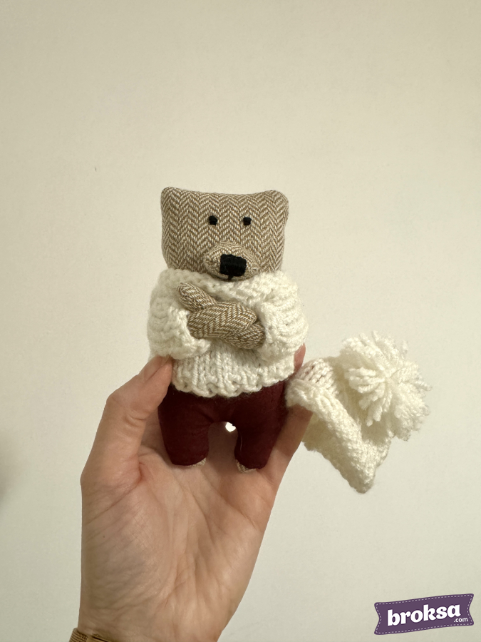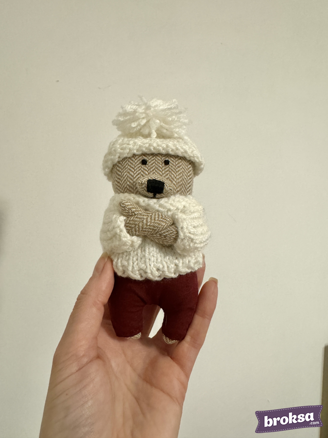 Mini teddy bear in a cream sweater and a pom-pom beanie. Beige tweed body, burgundy pants; the hat is removable. Eyes and nose are embroidered, no plastic. Hypoallergenic filling, soft to the touch. Careful handcrafting makes this little animal a striking prop for newborn and reborn shoots.