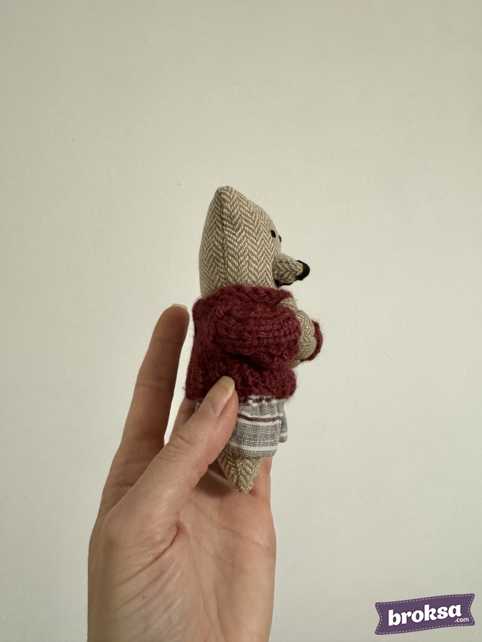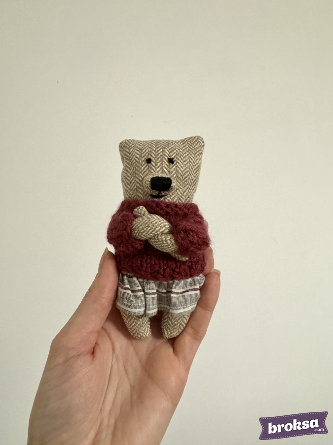 A mini bear was born in my workshop for shots with newborns and reborn dolls. The body is made of soft tweed fabric with a herringbone pattern, the nose and the eyes are embroidered. She’s wearing a puffy knitted sweater in burgundy and a striped skirt. The texture is gentle, the colors are warm. It’s the perfect animal as a toy for a photoshoot.
