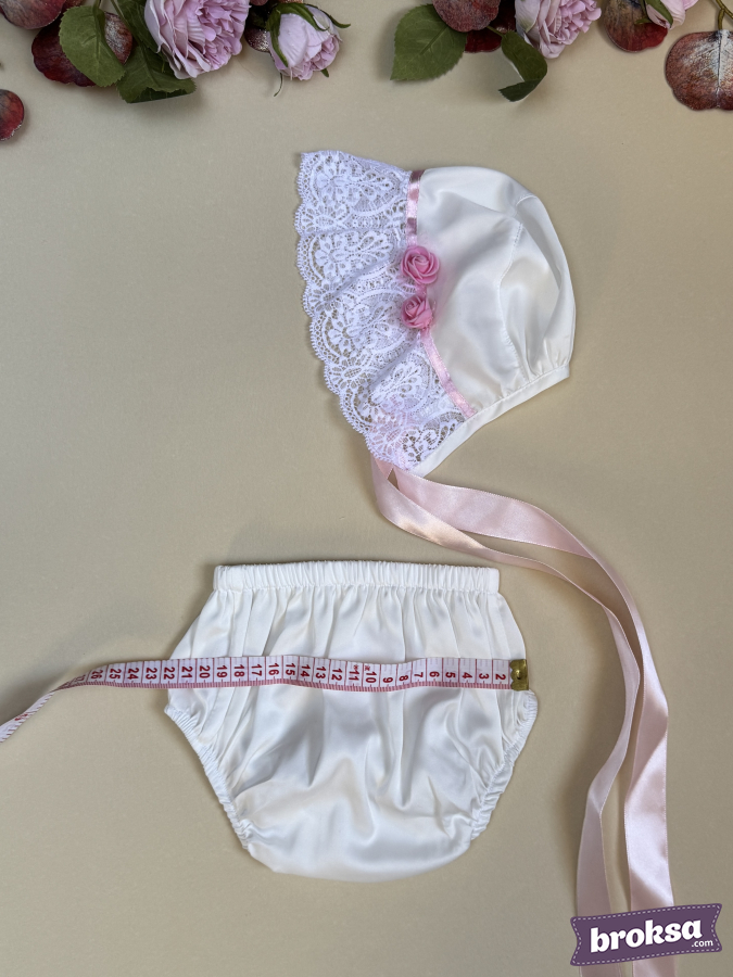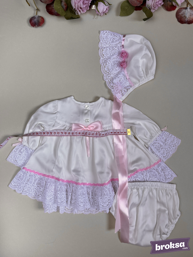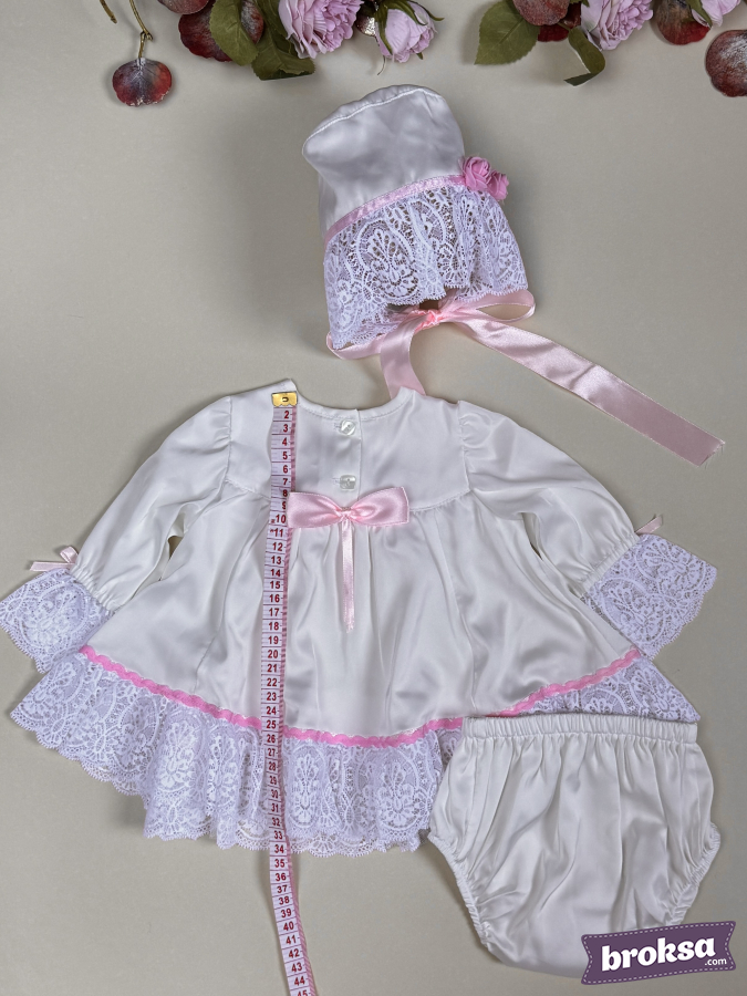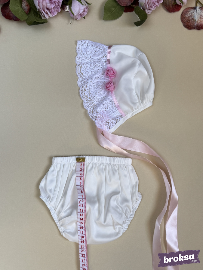 I present an exquisite artist-made set for a collectible reborn doll. The milky-white dress with a refined satin sheen softly flares toward the hem, accented with a wide lace flounce and a pink ribbon. The delicate lace yoke is adorned with three satin roses that add a touch of tenderness. Cuffs with lace ruffles, neat satin bows, and mother-of-pearl buttons on the back create a complete, truly collectible look. The bonnet with an airy lace brim and long satin ties elegantly frames the doll’s face, while the soft panties with gentle elastic ensure a tidy fit. The set looks impeccable on camera and in a display, ideal for those seeking exclusive sewn clothing for reborn dolls, artisan reborn outfits, and premium clothing for collectible reborn dolls with an emphasis on high craftsmanship and detail.