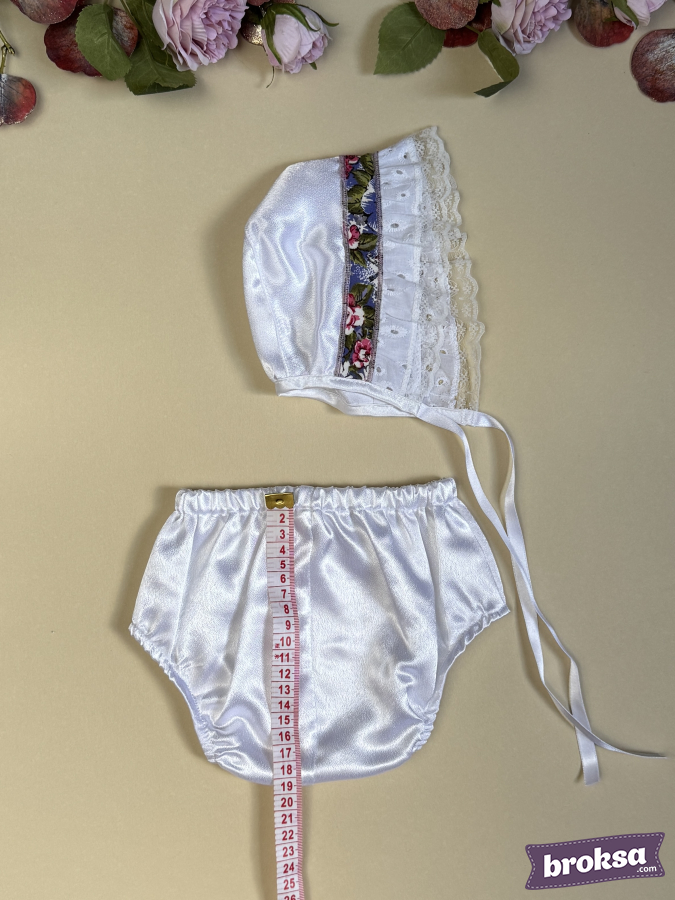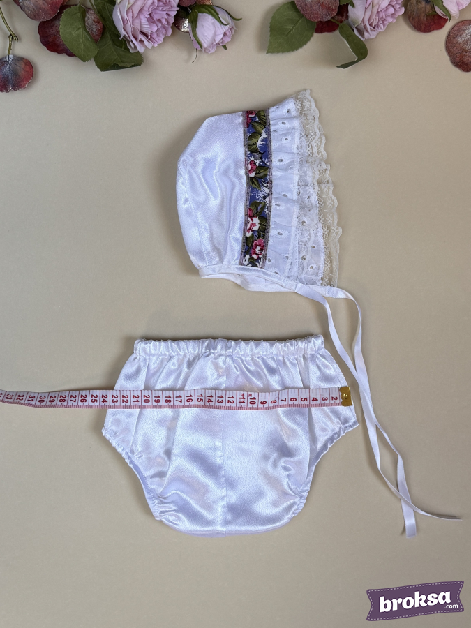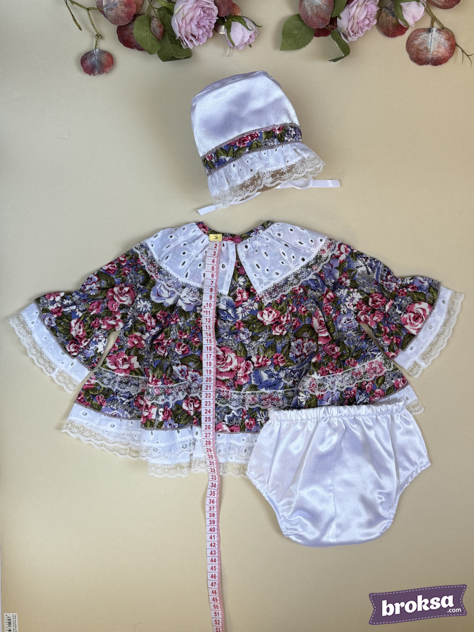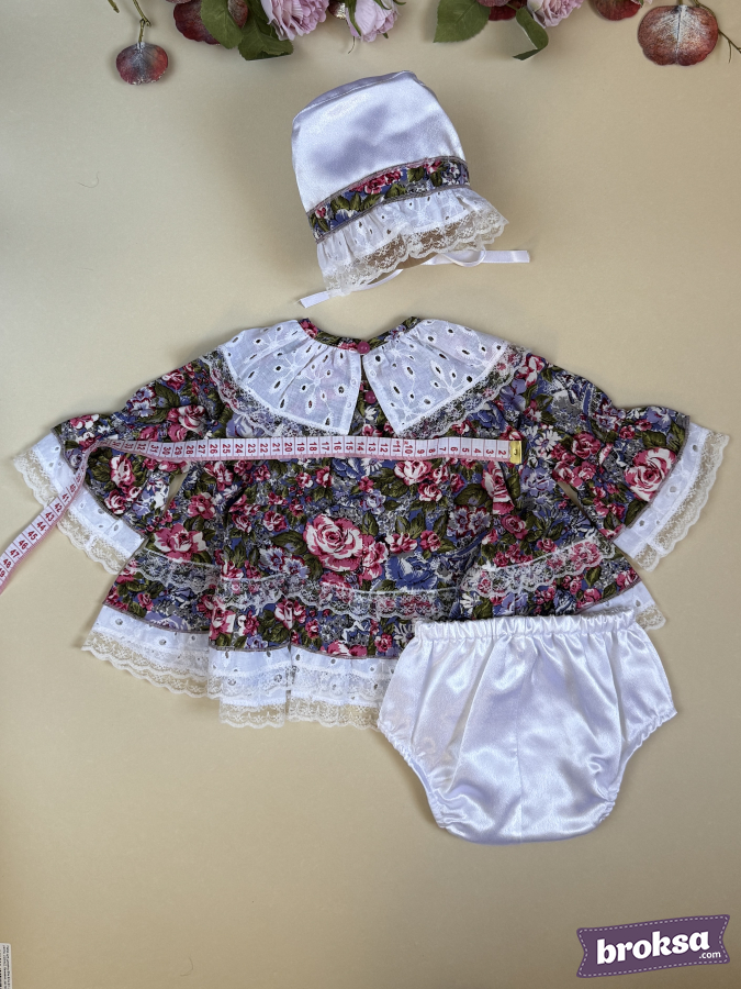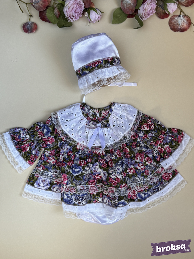 Materials: cotton with floral print, delicate lace, satin for the bonnet, satin ribbon.