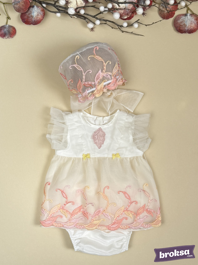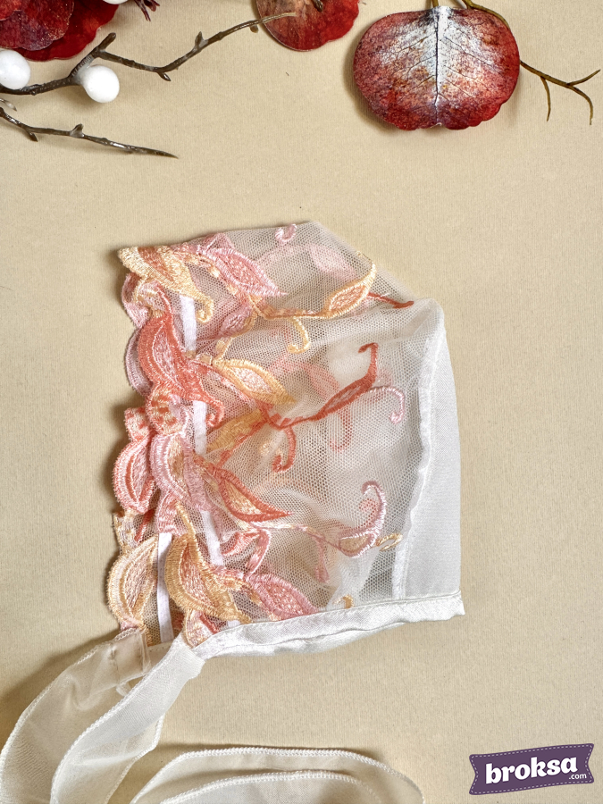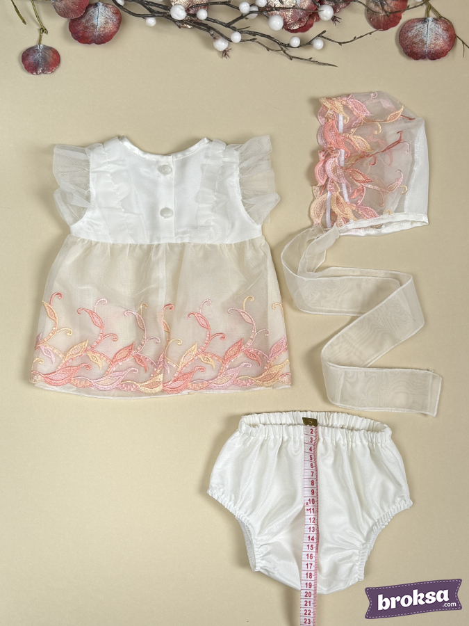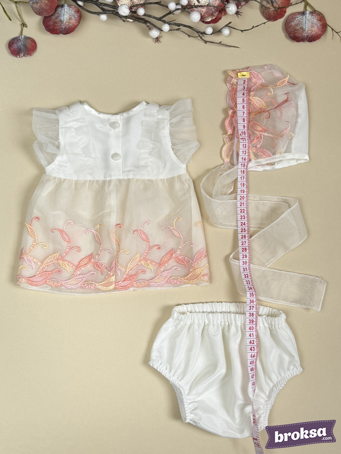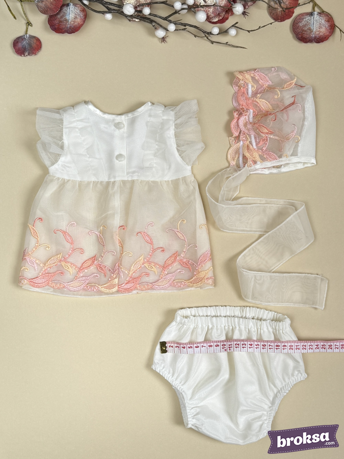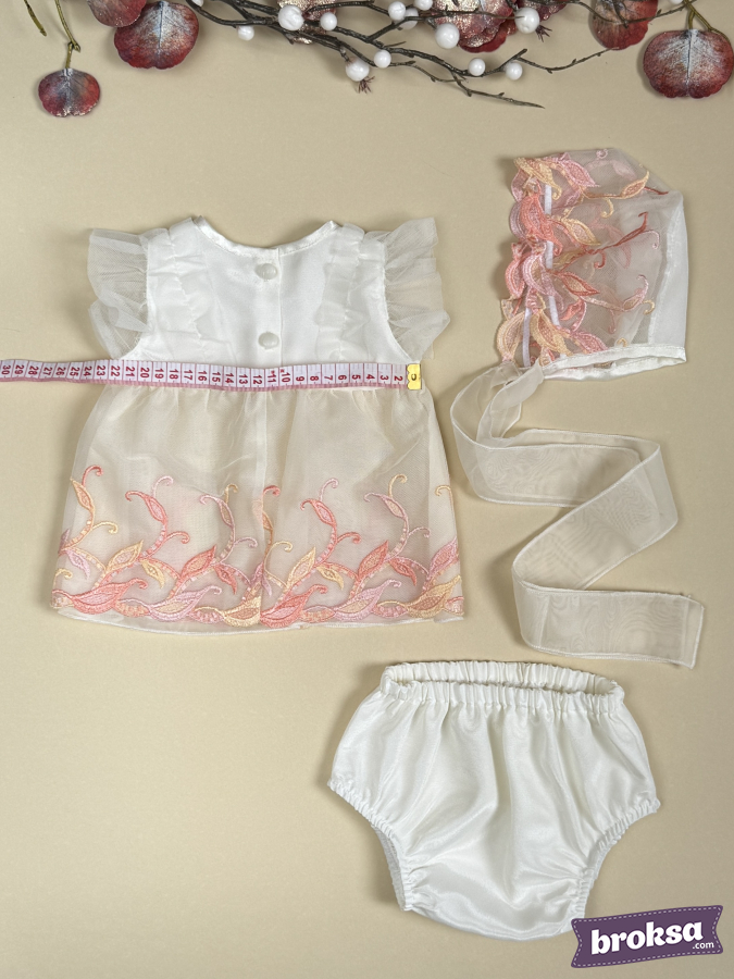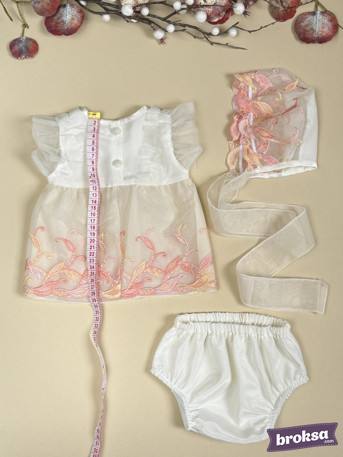 I present a refined author-designed set for collectible reborn dolls. The cream dress on a silky base fits delicately, while the transparent skirt of soft tulle shimmers thanks to leaf embroidery in a powder‑peach and champagne palette. Light flutter sleeves add airiness, there’s a neat accent on the chest, and the waist is emphasized by two miniature vanilla‑colored bows. The back fastens with tiny buttons, and the edges are finished flawlessly. The look is completed by a bonnet made of transparent mesh with the same embroidery and long semi‑transparent ties, as well as smooth briefs that ensure a clean silhouette line. This is truly an exclusive sewn outfit for reborn dolls, combining premium materials and high craftsmanship.