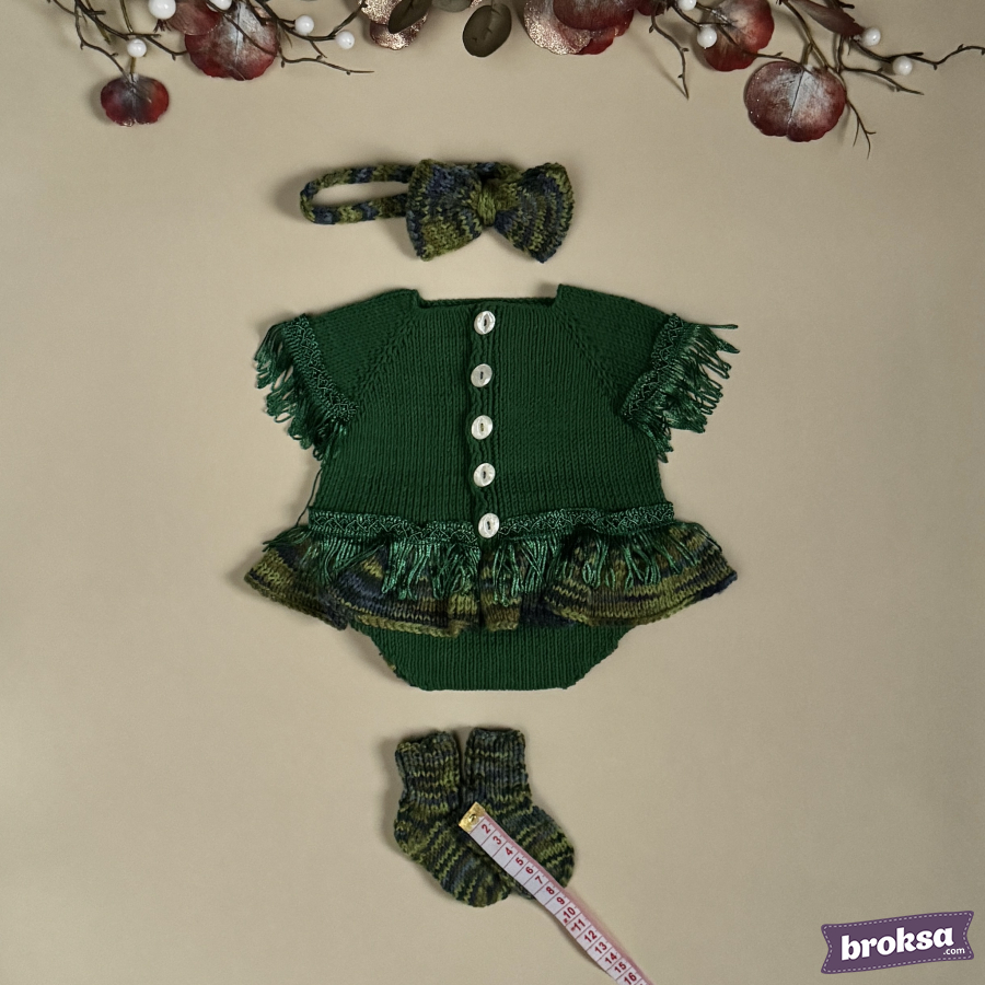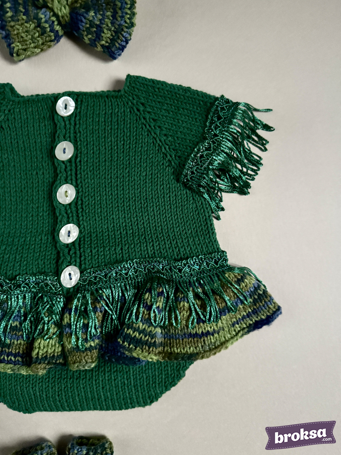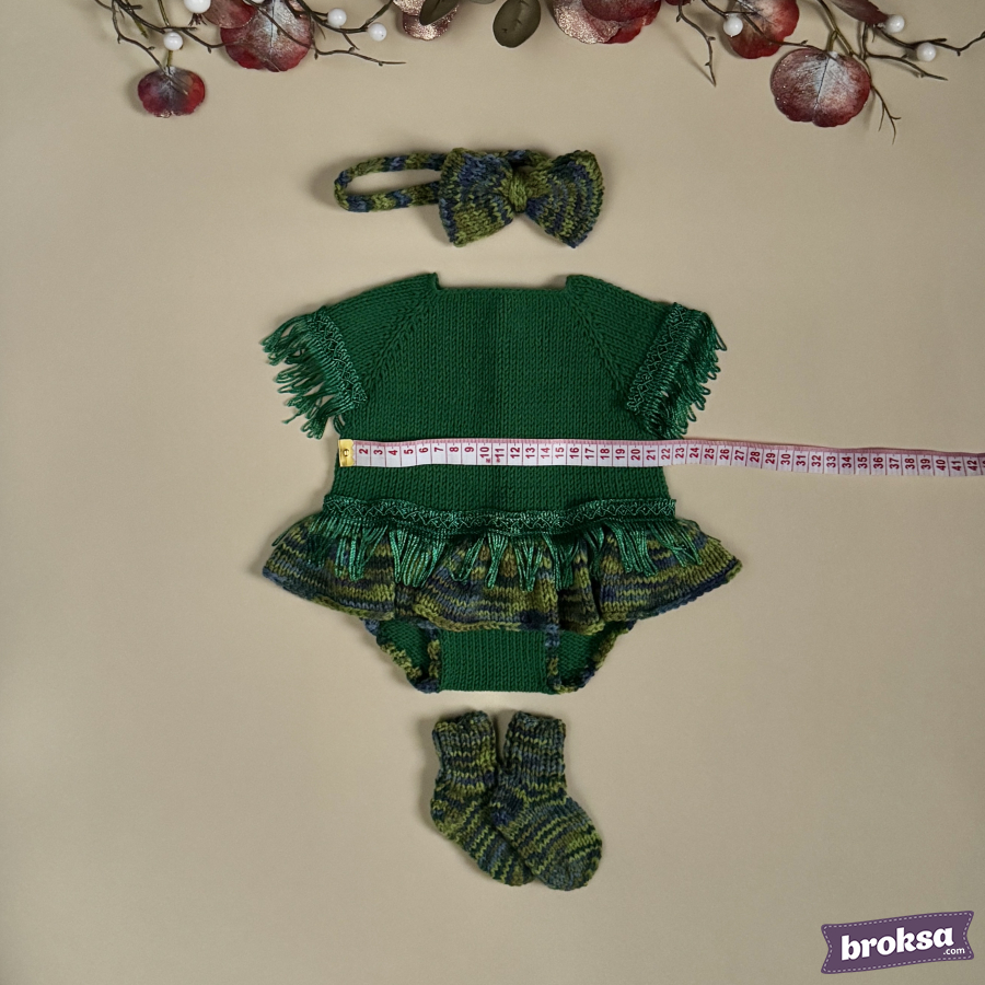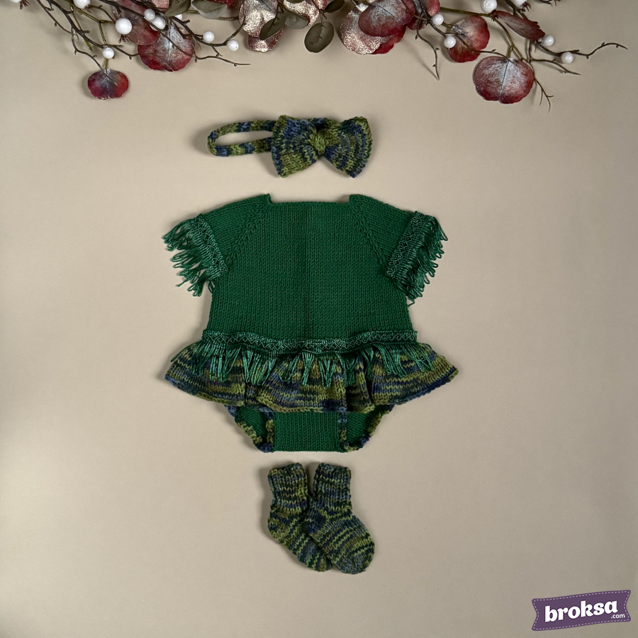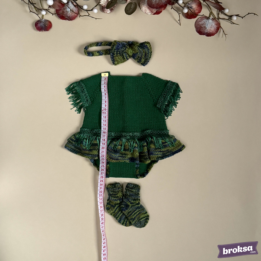 I’m offering a festive knitted set in a rich green. A bodysuit with a soft texture, short sleeves with tassels, and a wavy melange ruffle in forest tones. With it — socks and a bow headband. The look evokes New Year and evergreens, and appears clean and elegant on a collectible doll.