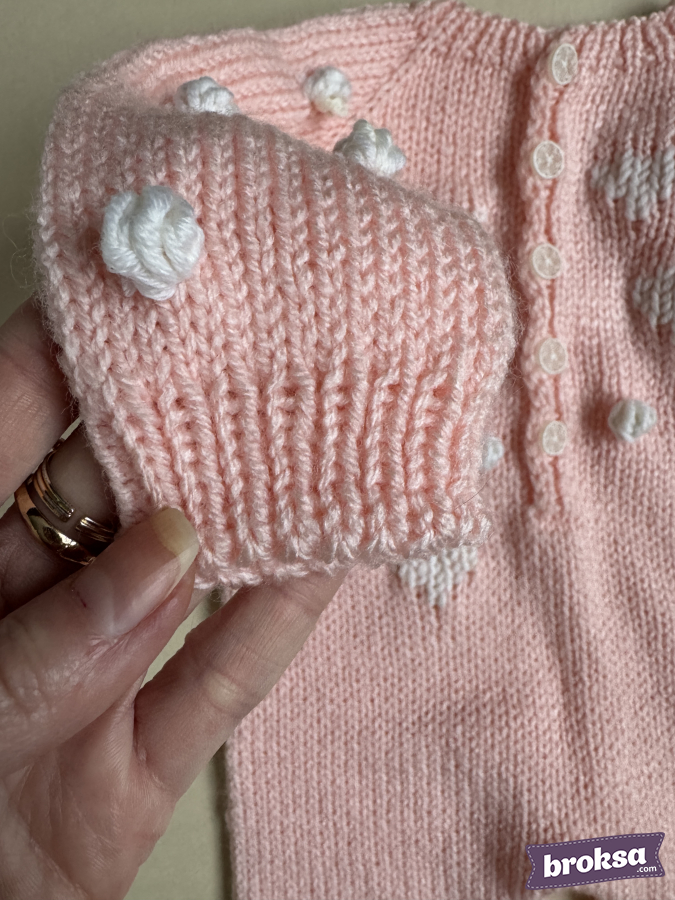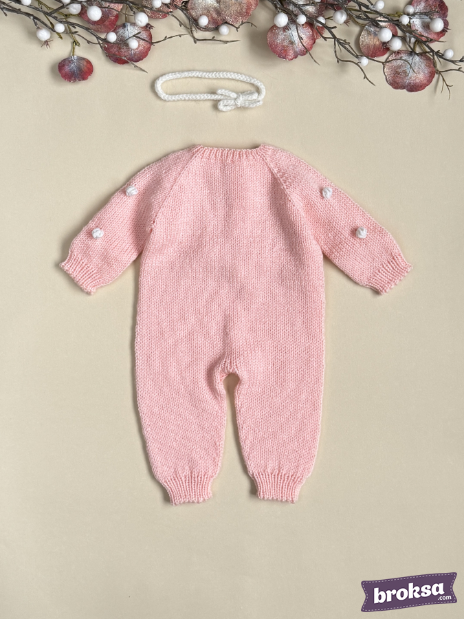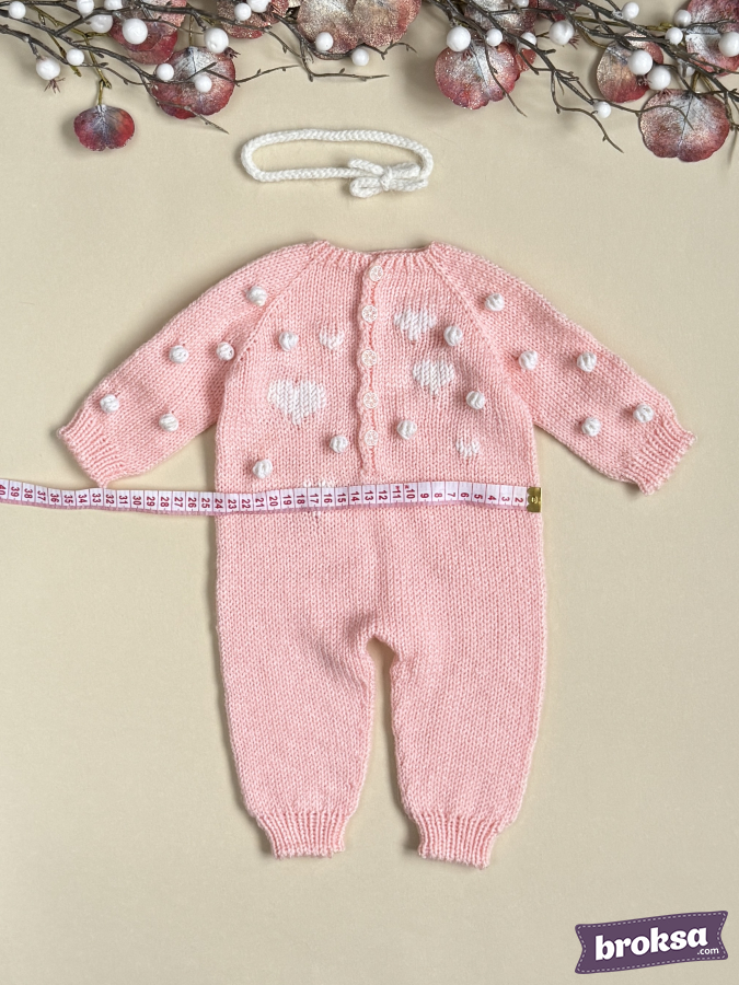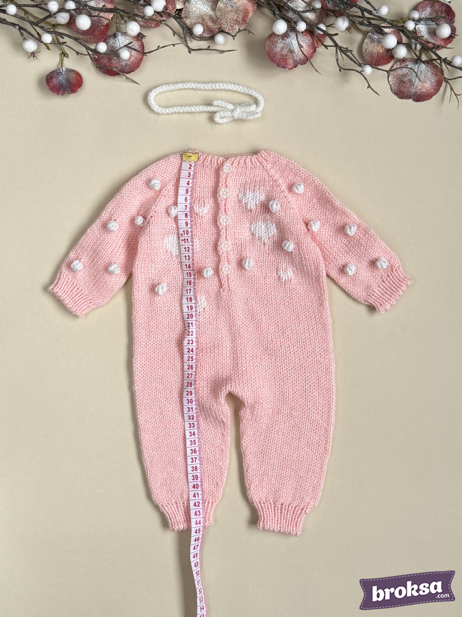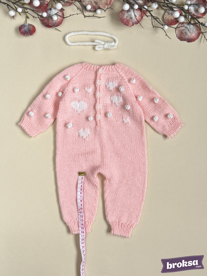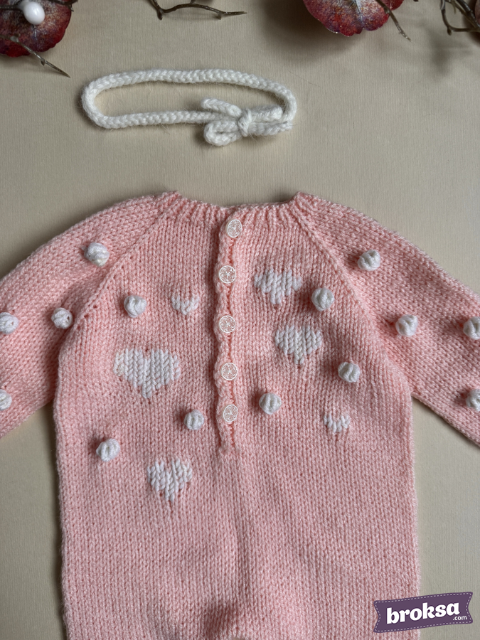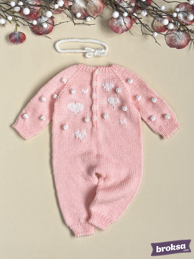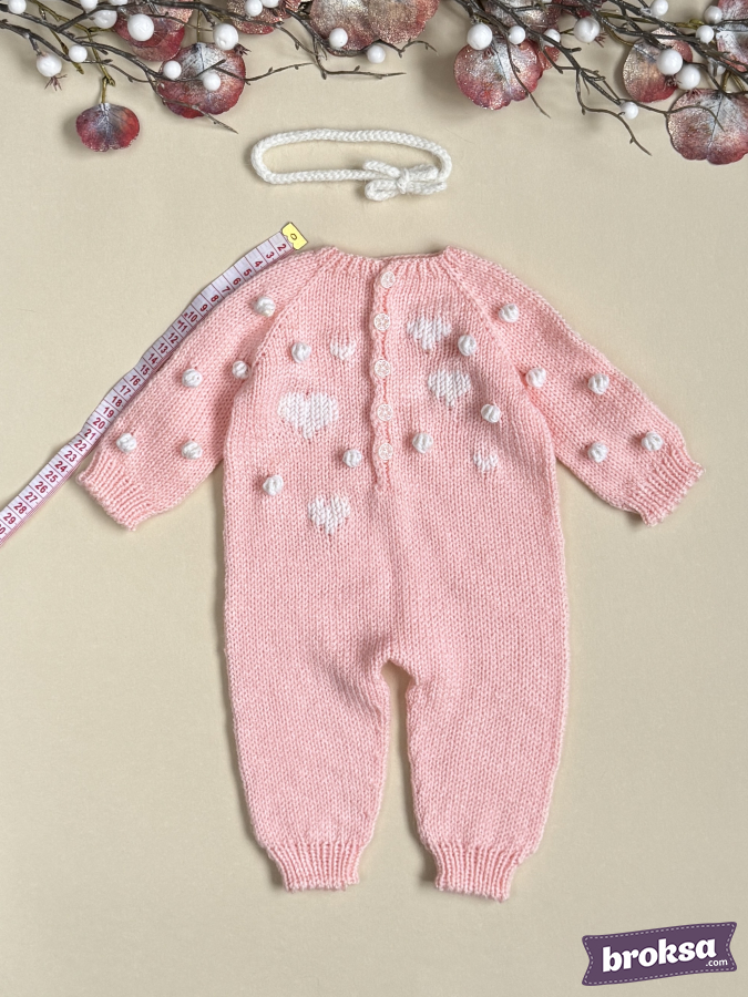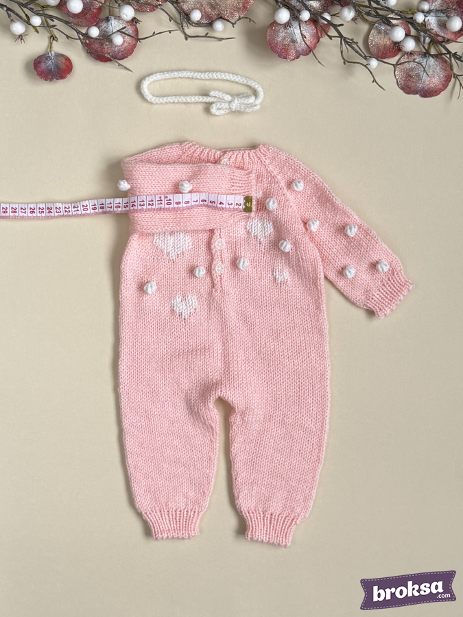I offer a knitted jumpsuit for a collectible reborn doll in a soft pink color. I choose gentle shades and textures to convey the mood of Valentine's Day. The white heart pattern and textured bobbles create a delicate relief, and the buttons look refined. Raglan construction and elastic cuffs ensure a crease-free fit, and attention to detail completes the look for photo shoots and window displays.