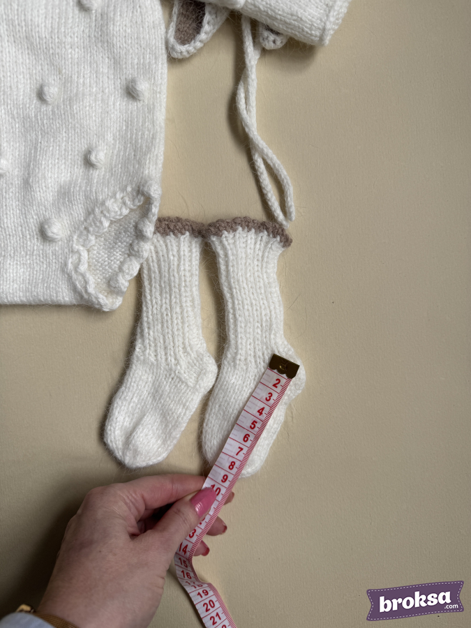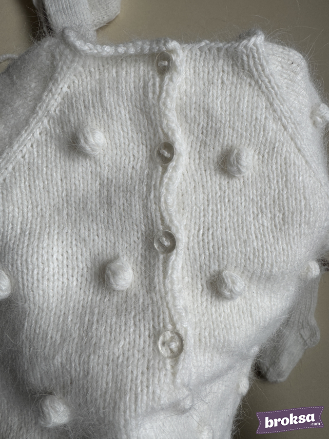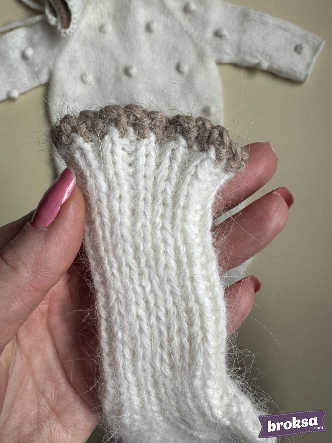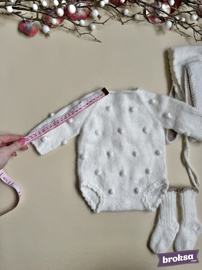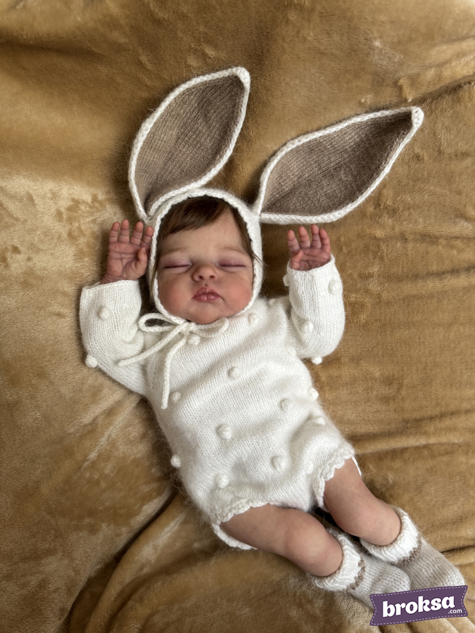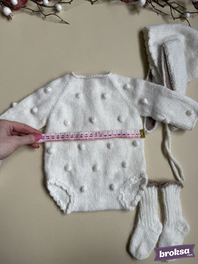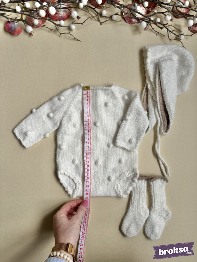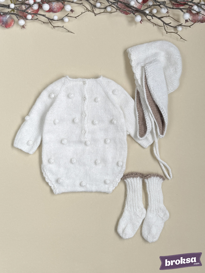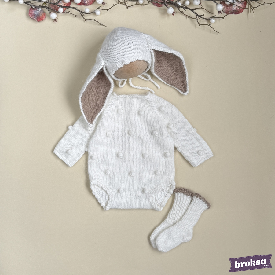 I offer a knitted set for a reborn doll in a milky-snow shade. The long-sleeve bodysuit has a soft texture with raised bubbles. A bonnet with long ears with beige inner sides, and socks with an elastic cuff. Thorough attention to detail and the beauty of the piece make the look expressive and complete.