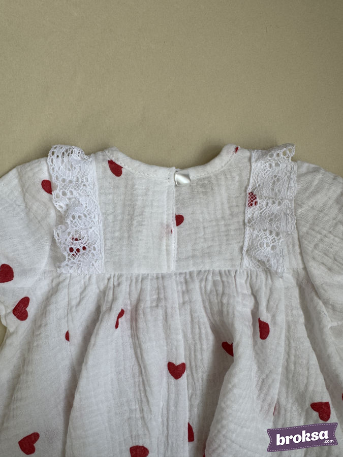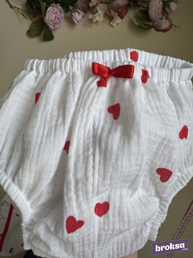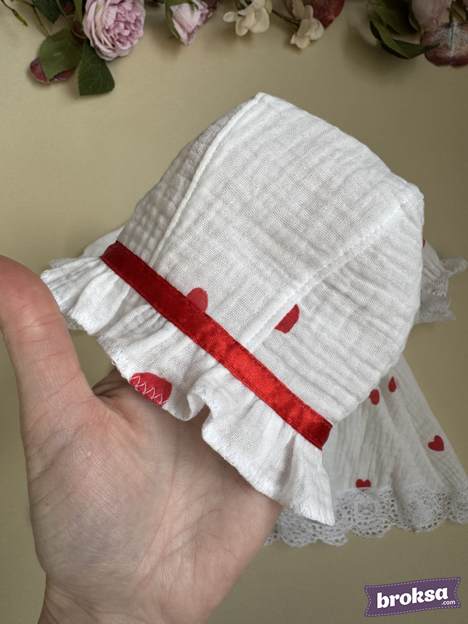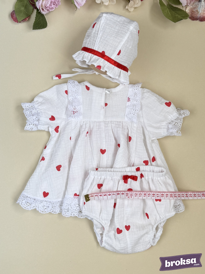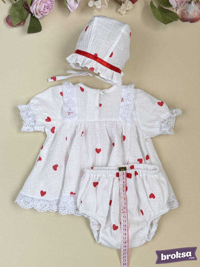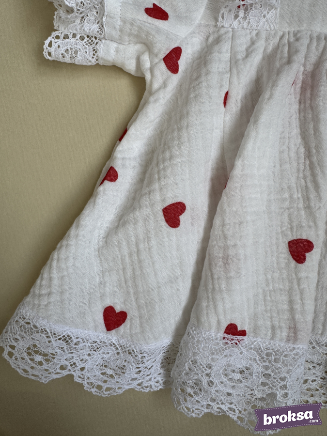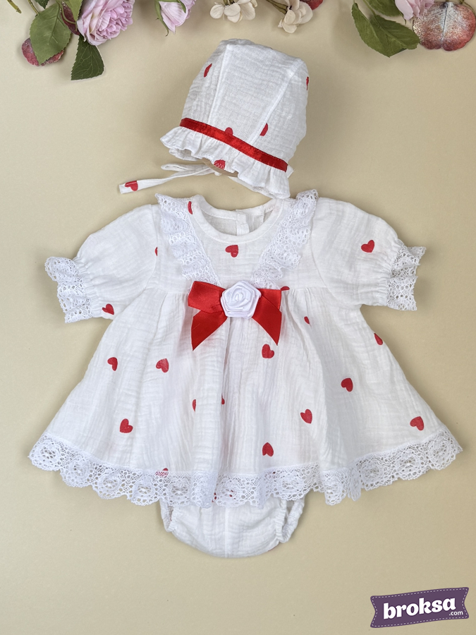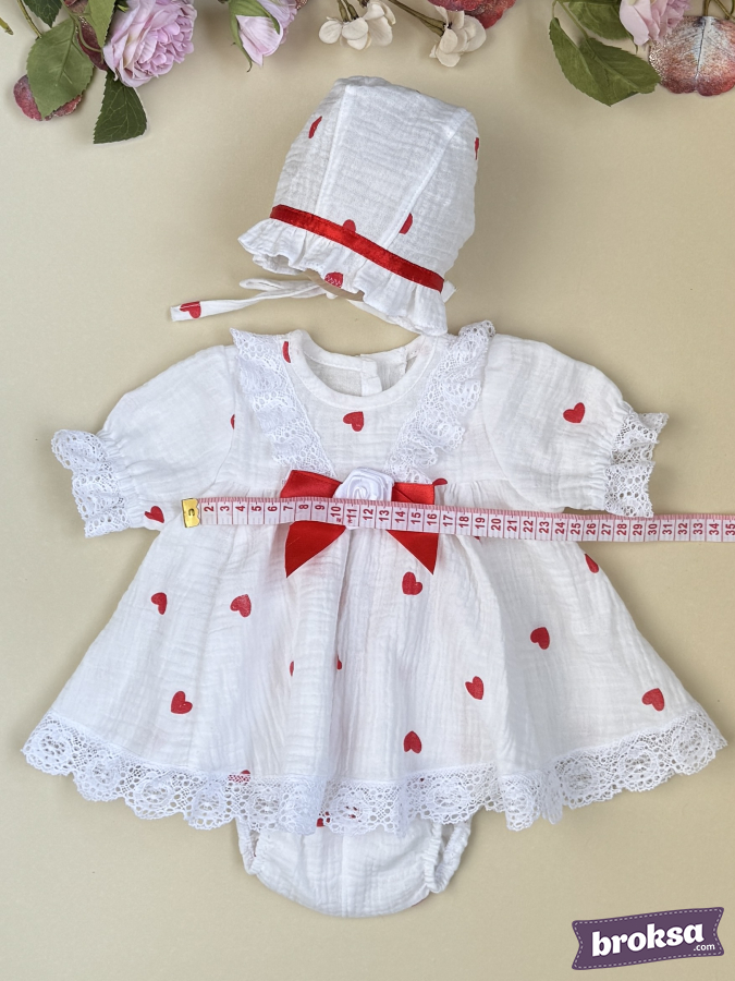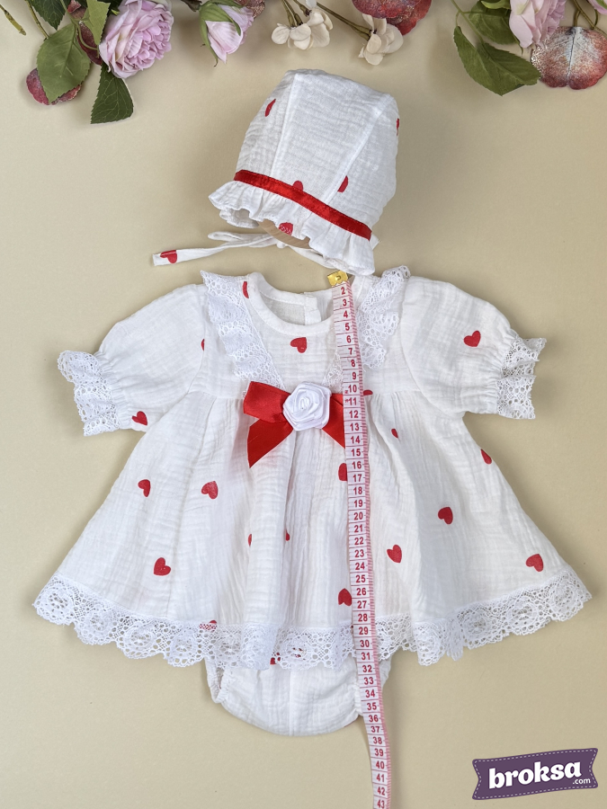 I present the refined designer set "My Heart" — premium sewn clothing for collectible reborn dolls. Pure white muslin, sprinkled with tiny red hearts, creates a light, festive mood for Valentine's Day. The soft texture of the fabric drapes delicately, highlighting a flawless fit. Openwork cotton lace on the sleeves and along the hem adds sophistication, while the central deep-red satin bow with a white flower accentuates the silhouette. The bonnet elegantly echoes with a tone-matched ribbon, and the panties fasten gently, providing a perfect finishing touch. This is an exclusive designer outfit for reborns, created with a focus on high craftsmanship, refined details, and a premium sense of collectible value.