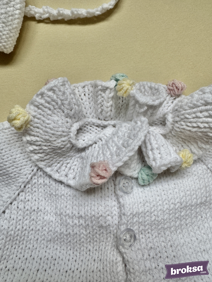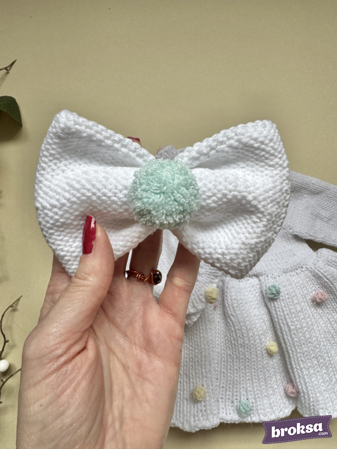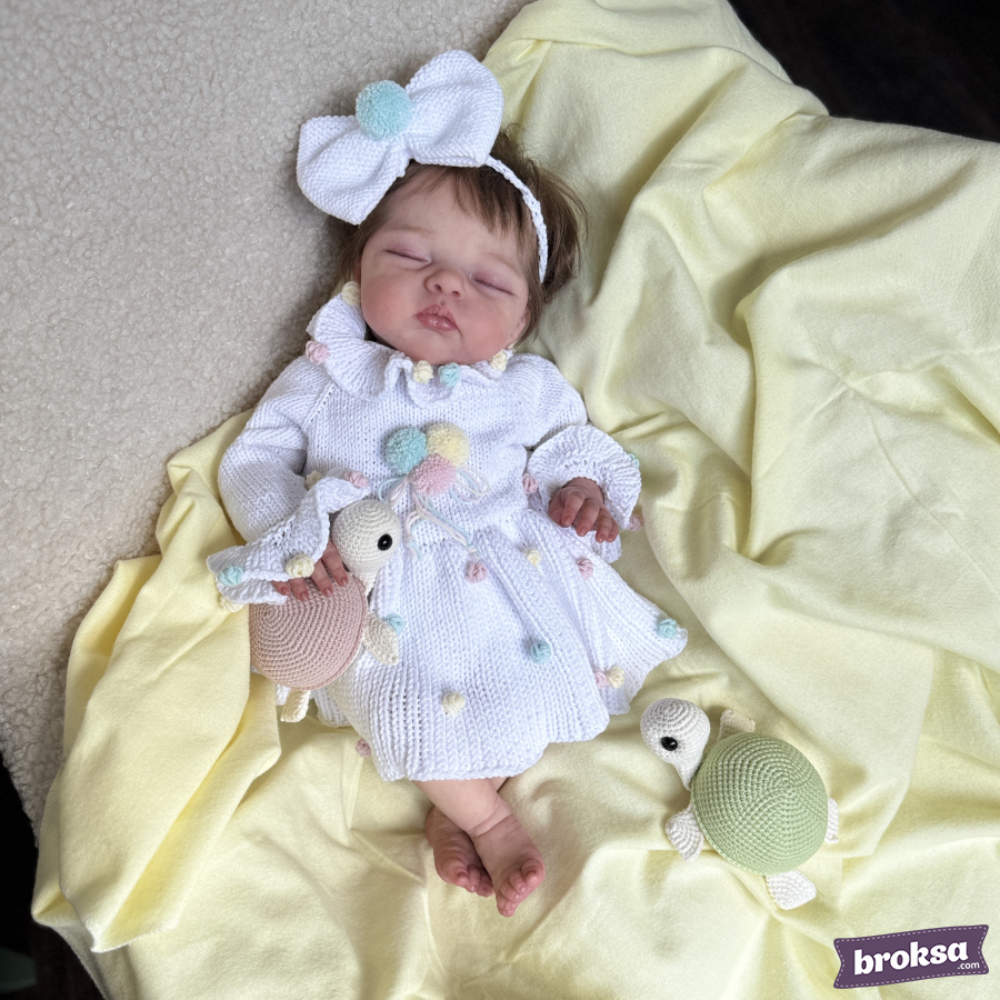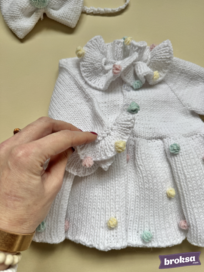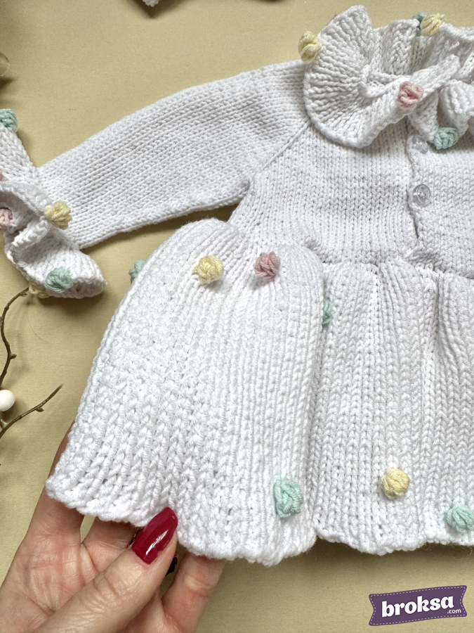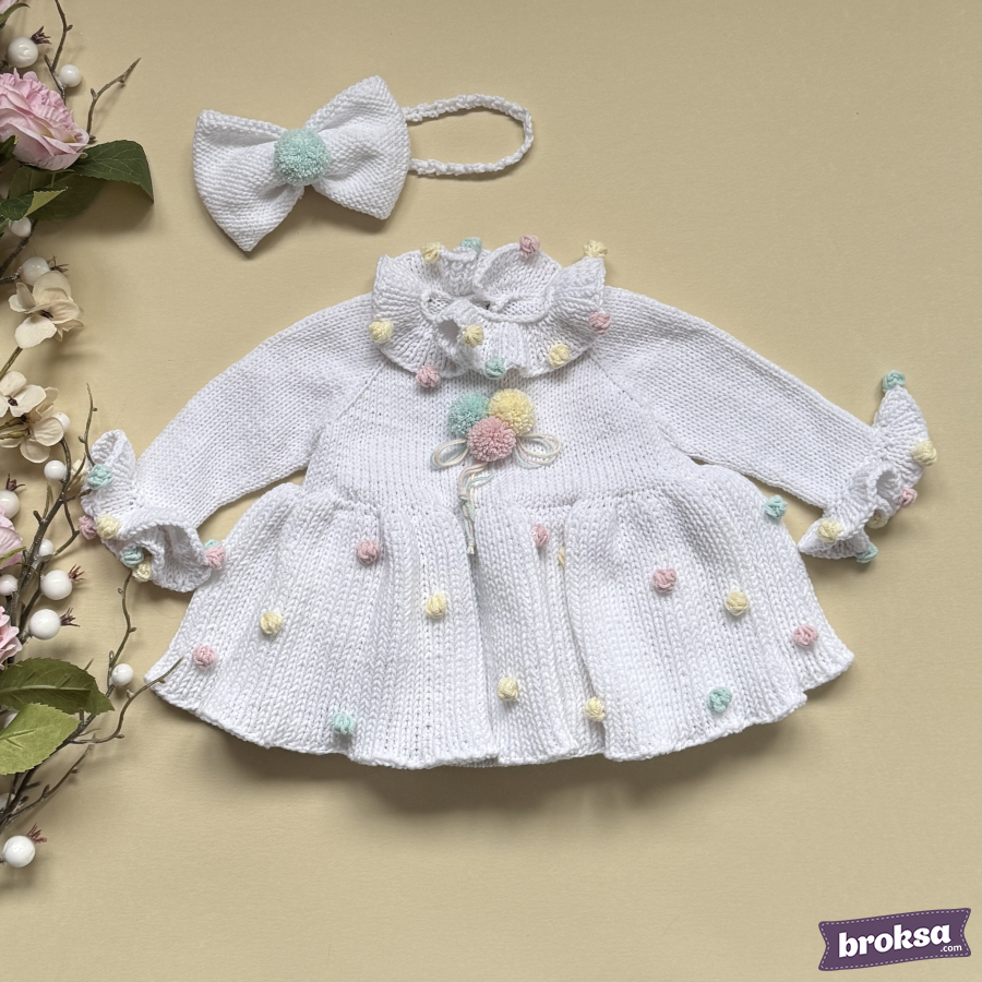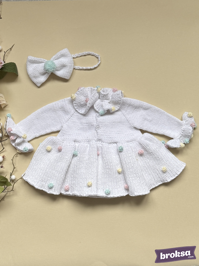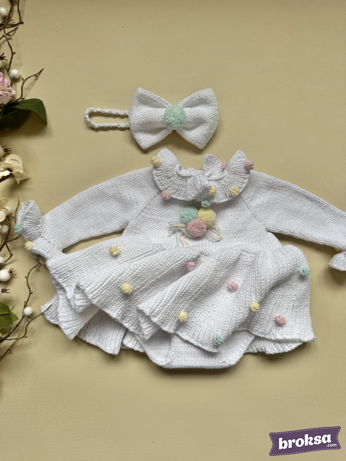 I offer an outfit for a reborn doll: a snow-white knitted long-sleeve dress and a bow headband. Fluffy pastel pompoms—like marshmallow and ice cream—are scattered over the skirt, collar, and cuffs. The silhouette sits softly without unnecessary folds, and the details are neatly finished. This is a stylish outfit for a collectible doll that makes the look stand out.
