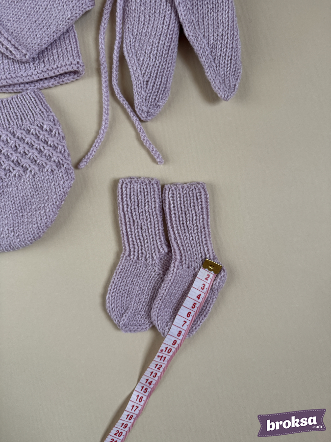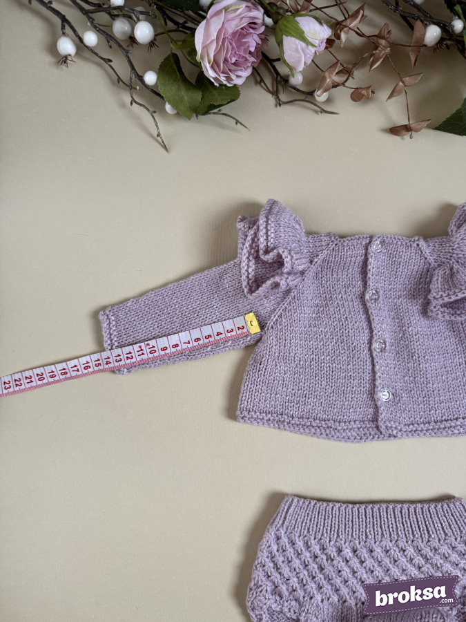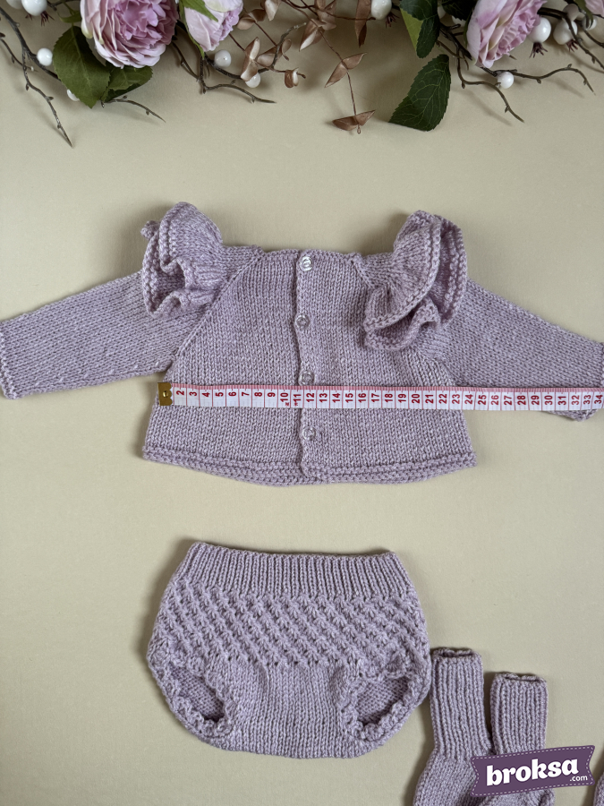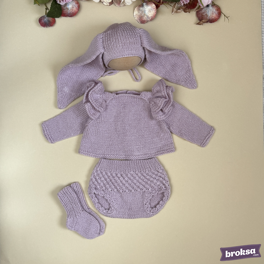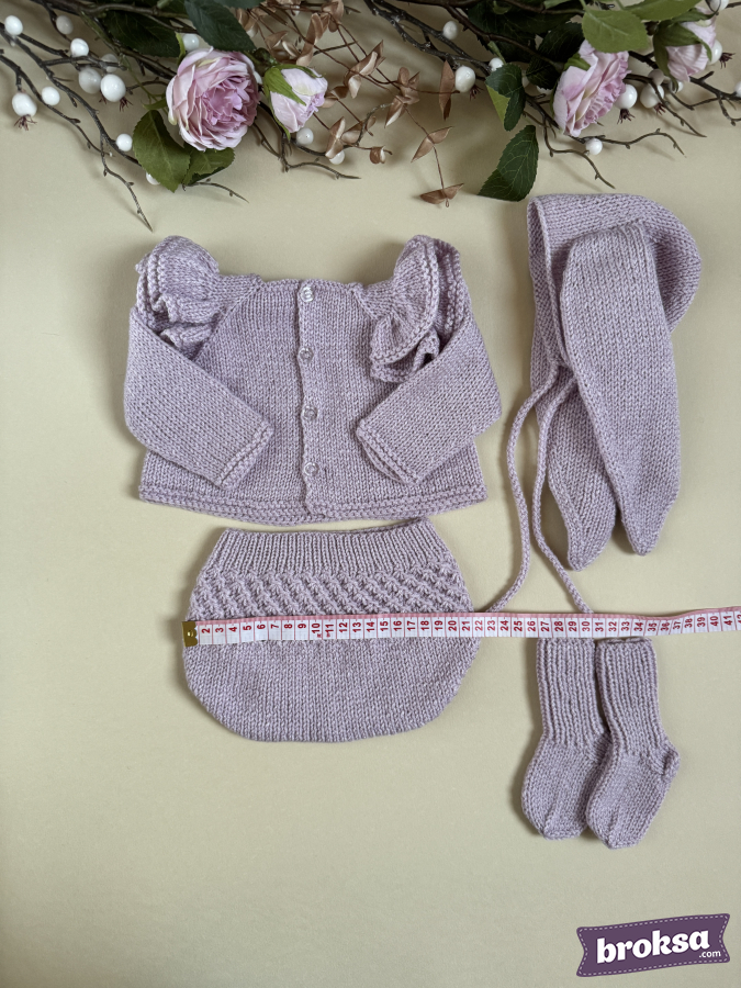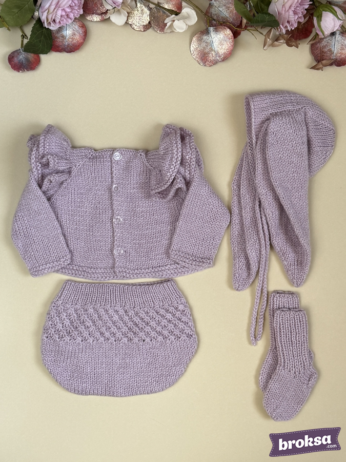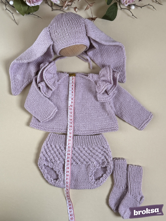 I offer a soft-lilac knitted set for a reborn doll. The set includes a bonnet with long ears, a ruffled button-up cardigan, knitted panties and socks. The soft knit, clean edges, delicate ruffles and neat buttons highlight attention to detail and give an elegant, finished look.